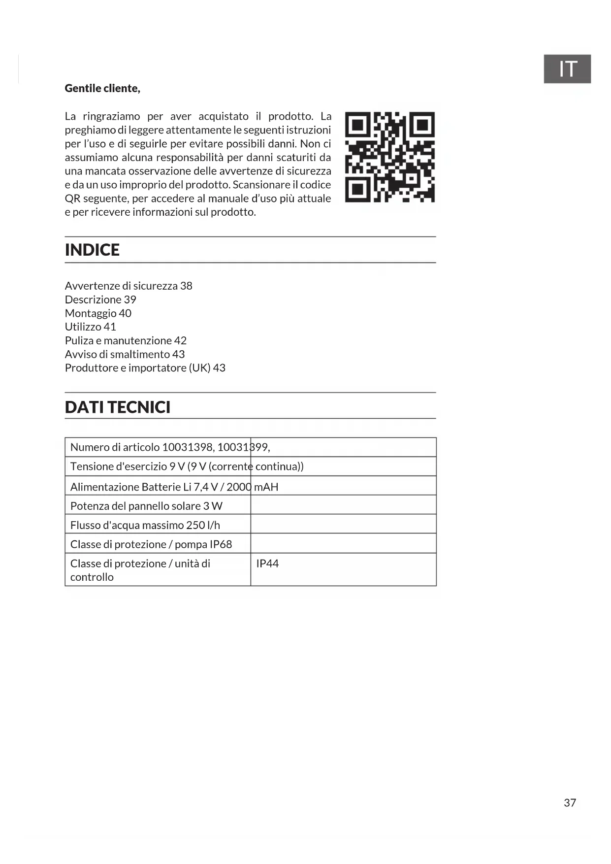 La ringraziamo per aver acquistato il prodotto. La preghiamo di leggere attendamente le seguenti istruzioni per l'uso e di seguirle per evitare possibili danni. Non ci assumiamo una responsabilità per anni scaturiti da una mancata osservazione delle avventenze di sicurezza e da un uso improprio del prodotto. Scansionare il codice QR seguite, per accedere al manuale d'uso più attuale e per ricevere informazioni sul prodotto.