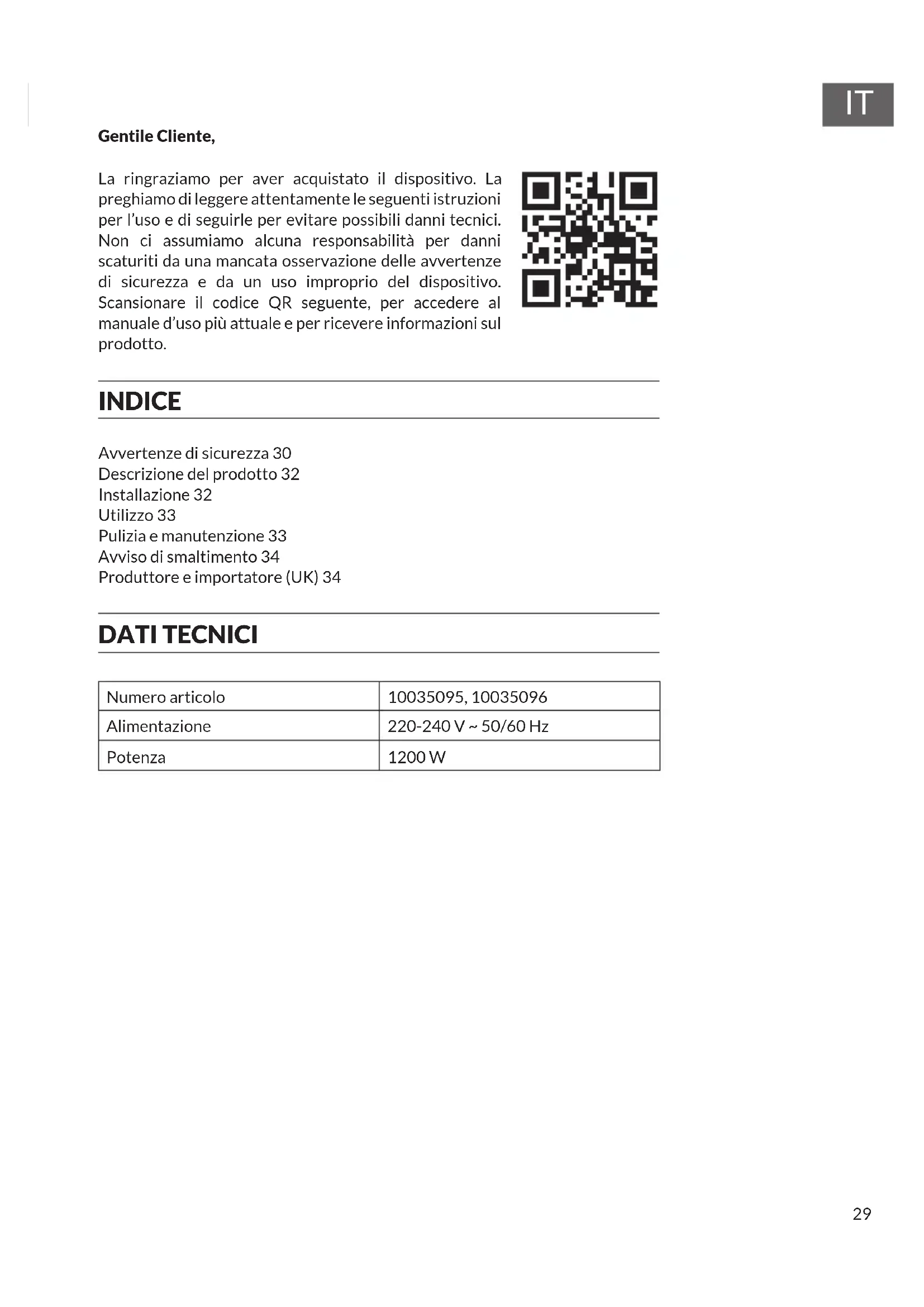 Gentile Cliente, La ringraziamo per aver acquistato il dispositivo. La preghiamo di leggere attentamente le seguenti istruzioni per l’uso e di seguirle per evitare possibili danni tecnici. Non ci assumiamo alcuna responsabilità per danni scaturiti da una mancata osservazione delle avvertenze di sicurezza e da un uso improprio del dispositivo. Scansionare il codice QR seguente, per accedere al manuale d’uso più attuale e per ricevere informazioni sul prodotto. INDICE Avvertenze di sicurezza 30 Descrizione del prodotto 32 Installazione 32 Utilizzo 33 Pulizia e manutenzione 33 Avviso di smaltimento 34 Produttore e importatore (UK) 34 DATI TECNICI Numero articolo 10035095, 10035096 Alimentazione 220-240 V ~ 50/60 Hz Potenza 1200 W30