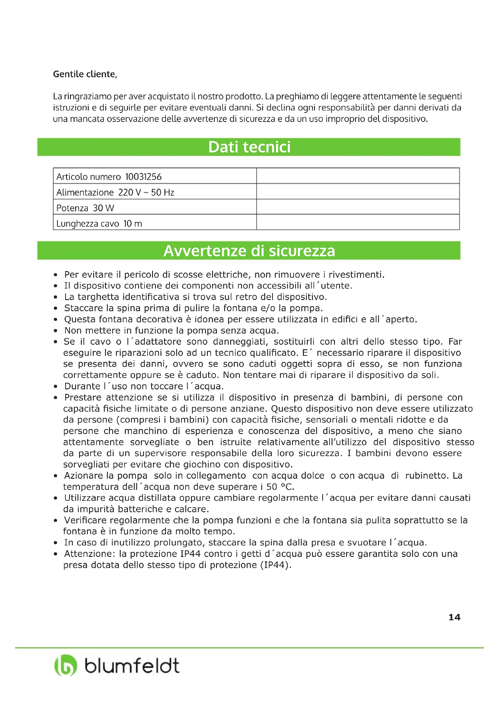Scarica le istruzioni per il tuo Pompa dell'acqua in formato PDF gratuitamente! Trova il tuo manuale Lemuria - Blumfeldt e riprendi in mano il tuo dispositivo elettronico. In questa pagina sono pubblicati tutti i documenti necessari per l'utilizzo del tuo dispositivo. Lemuria del marchio Blumfeldt.
