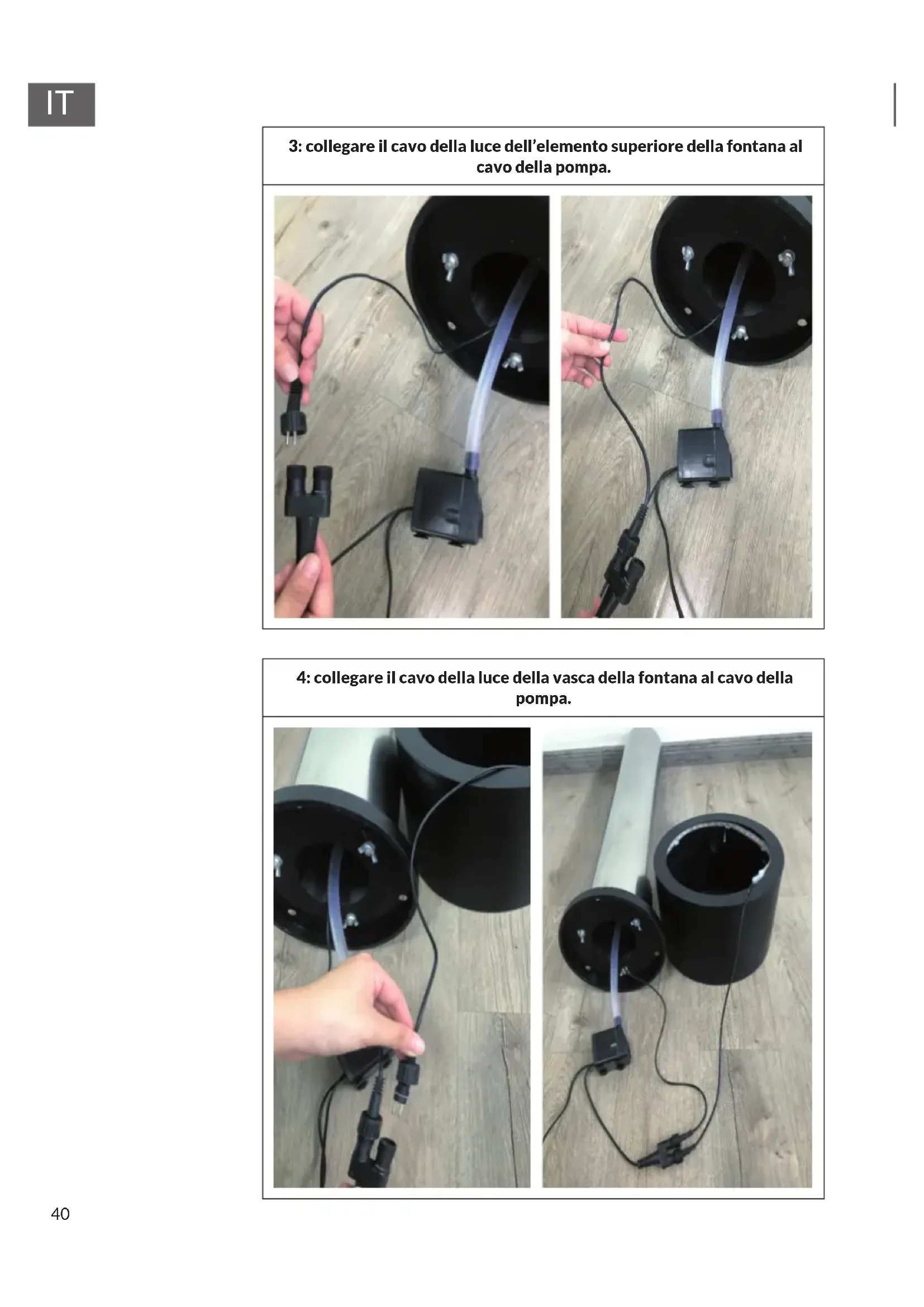 3: collegare il cavo della luce dell’elemento superiore della fontana al cavo della pompa. 4: collegare il cavo della luce della vasca della fontana al cavo della pompa.41