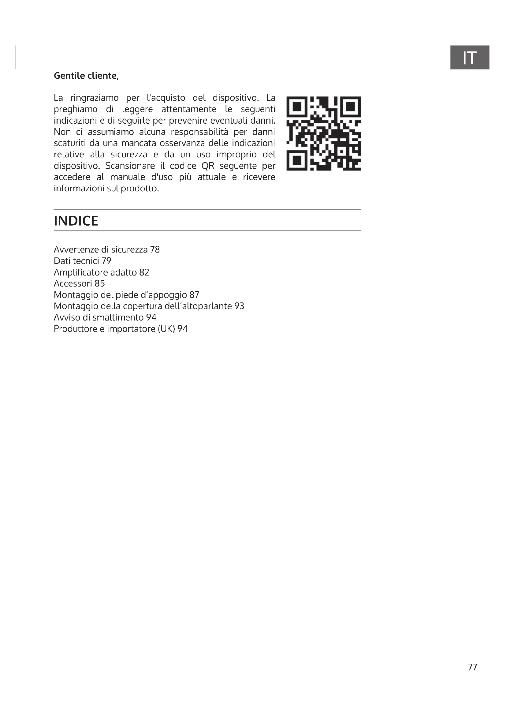 Gentile cliente, La ringraziamo per l'acquisto del dispositivo. La preghiamo di leggere attentamente le seguenti indicazioni e di seguirle per prevenire eventuali danni. Non ci assumiamo alcuna responsabilità per danni scaturiti da una mancata osservanza delle indicazioni relative alla sicurezza e da un uso improprio del dispositivo. Scansionare il codice QR seguente per accedere al manuale d'uso più attuale e ricevere informazioni sul prodotto. INDICE Avvertenze di sicurezza 78 Dati tecnici 79 Amplicatore adatto 82 Accessori 85 Montaggio del piede d‘appoggio 87 Montaggio della copertura dell‘altoparlante 93 Avviso di smaltimento 94 Produttore e importatore (UK) 9478