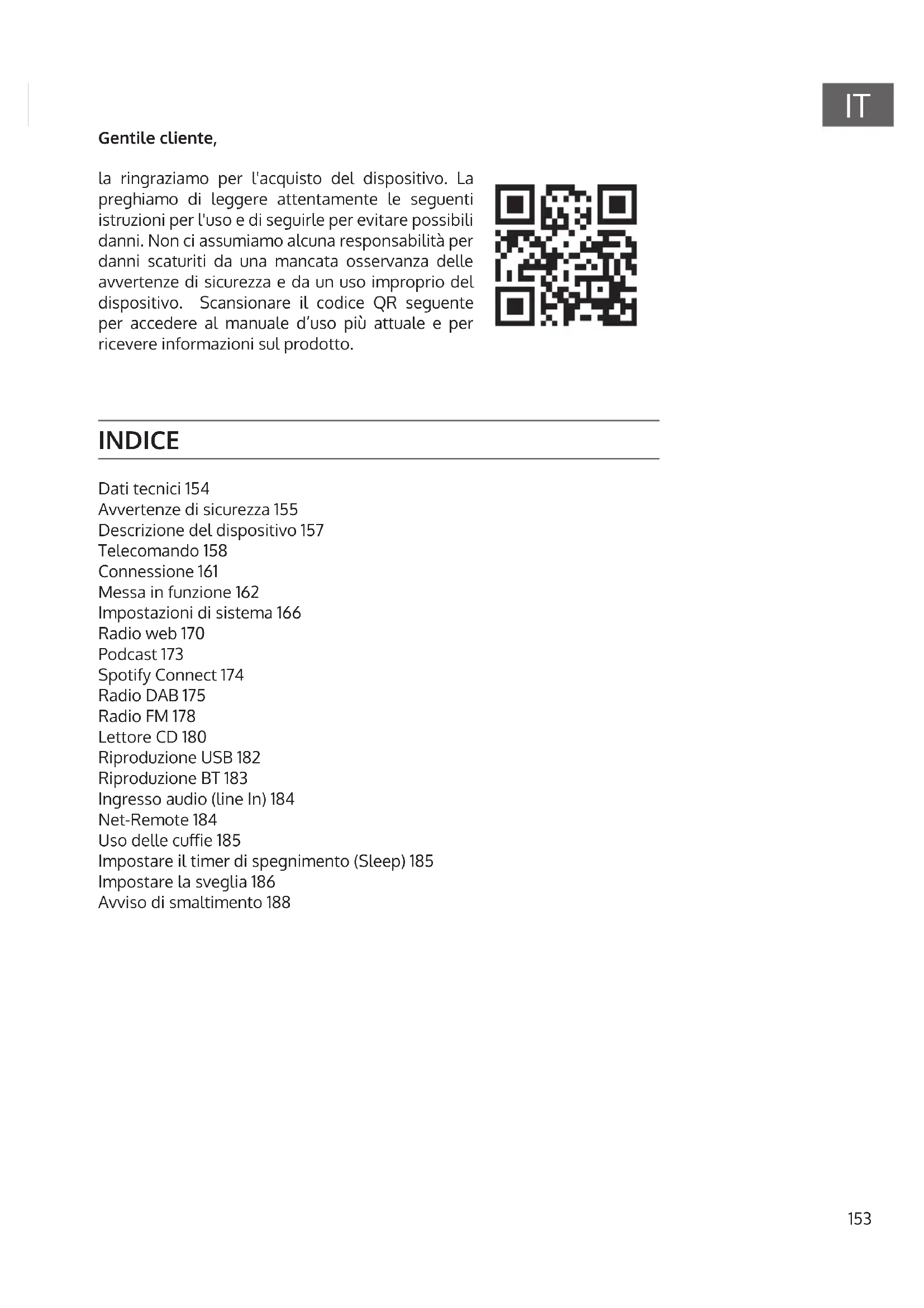 Dati tecnici 154 Avvertenze di sicurezza 155 Descrizione del dispositivo 157 Telecomando 158 Connessione 161 Messa in funzione 162 Impostazioni di sistema 166 Radio web 170 Podcast 173 Spotify Connect 174 Radio DAB 175 Radio FM 178 Lettore CD 180 Riproduzione USB 182 Riproduzione BT 183 Ingresso audio (line In) 184 Net-Remote 184 Uso delle cuie 185 Impostare il timer di spegnimento (Sleep) 185 Impostare la sveglia 186 Avviso di smaltimento 188 INDICE Gentile cliente, la ringraziamo per l'acquisto del dispositivo. La preghiamo di leggere attentamente le seguenti istruzioni per l'uso e di seguirle per evitare possibili danni. Non ci assumiamo alcuna responsabilità per danni scaturiti da una mancata osservanza delle avvertenze di sicurezza e da un uso improprio del dispositivo. Scansionare il codice QR seguente per accedere al manuale d’uso più attuale e per ricevere informazioni sul prodotto.154