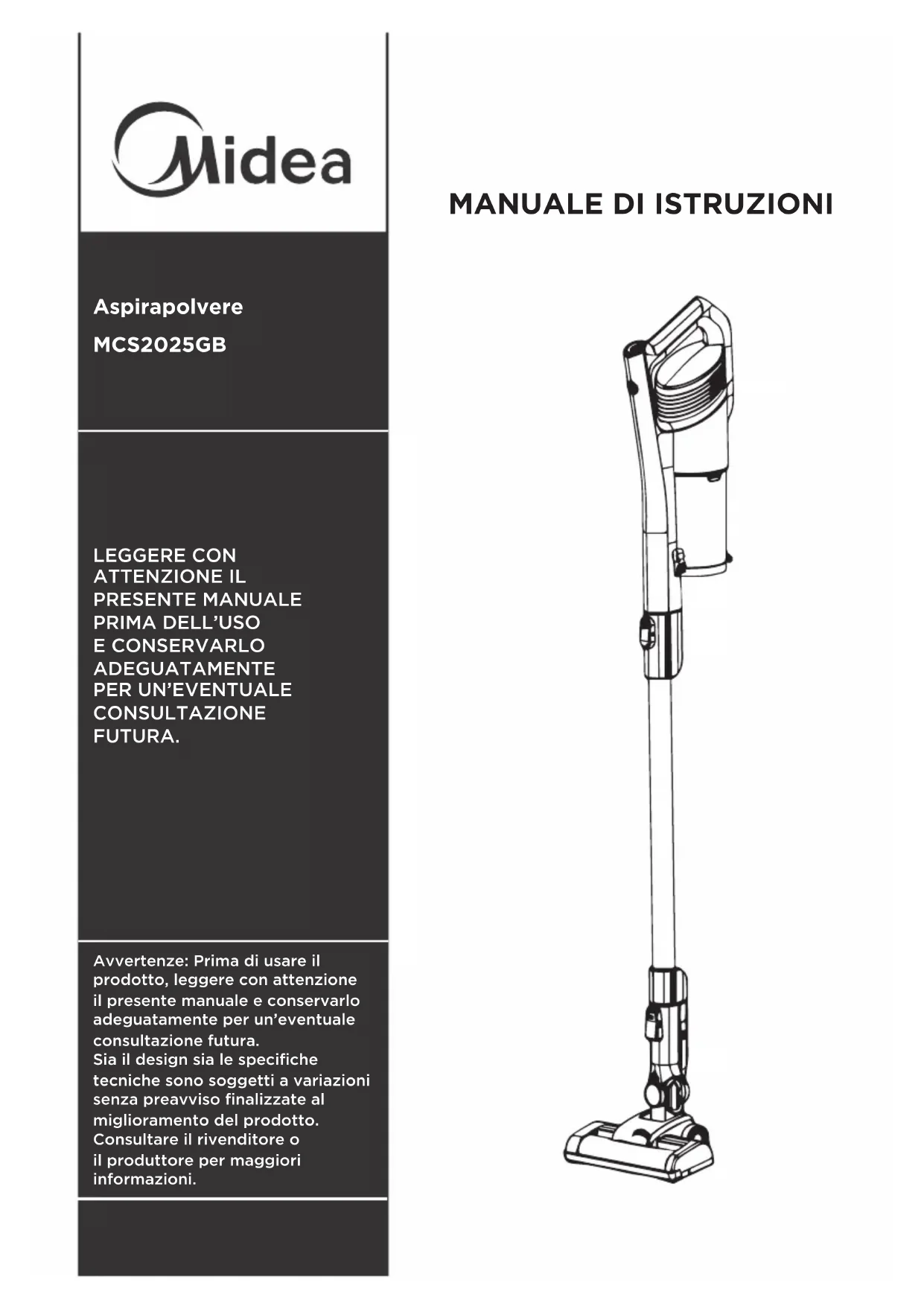 CONSULTAZIONE FUTURA. Avvertenze: Prima di usare il prodotto, leggere con attenzione il presente manuale e conservarlo adeguatamente per un’eventuale consultazione futura. Sia il design sia le specifiche tecniche sono soggetti a variazioni senza preavviso finalizzate al miglioramento del prodotto. Consultare il rivenditore o il produttore per maggiori informazioni. MCS2025GBImportanti istruzioni di sicurezza