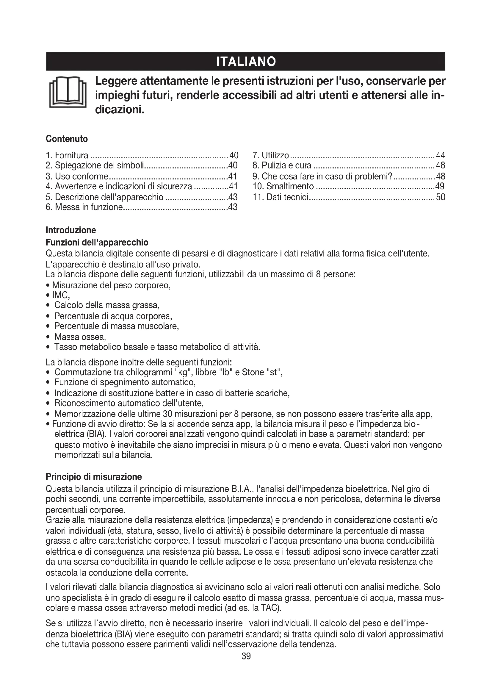 denza bioelettrica (BIA) viene eseguito con parametri standard; si tratta quindi solo di valori approssimativi che tuttavia possono essere parimenti validi nell’osservazione della tendenza. Leggere attentamente le presenti istruzioni per l'uso, conservarle per impieghi futuri, renderle accessibili ad altri utenti e attenersi alle in- dicazioni. Contenuto40