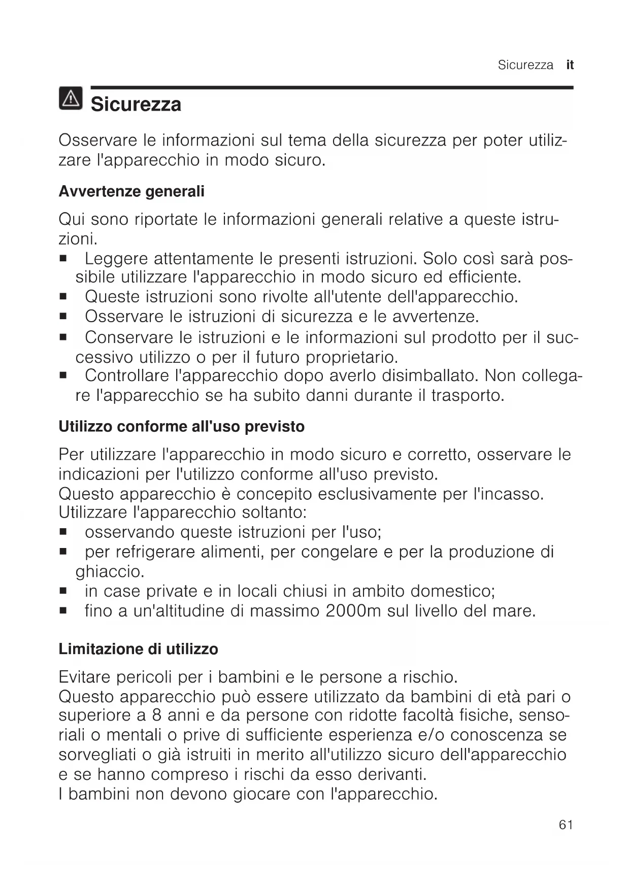 Sicurezza Osservare le informazioni sul tema della sicurezza per poter utiliz- zare l'apparecchio in modo sicuro. Avvertenze generali Qui sono riportate le informazioni generali relative a queste istru- zioni. ¡ Leggere attentamente le presenti istruzioni. Solo così sarà pos- sibile utilizzare l'apparecchio in modo sicuro ed efficiente. ¡ Queste istruzioni sono rivolte all'utente dell'apparecchio. ¡ Osservare le istruzioni di sicurezza e le avvertenze. ¡ Conservare le istruzioni e le informazioni sul prodotto per il suc- cessivo utilizzo o per il futuro proprietario. ¡ Controllare l'apparecchio dopo averlo disimballato. Non collega- re l'apparecchio se ha subito danni durante il trasporto. Utilizzo conforme all'uso previsto Per utilizzare l'apparecchio in modo sicuro e corretto, osservare le indicazioni per l'utilizzo conforme all'uso previsto. Questo apparecchio è concepito esclusivamente per l'incasso. Utilizzare l'apparecchio soltanto: ¡ osservando queste istruzioni per l'uso; ¡ per refrigerare alimenti, per congelare e per la produzione di ghiaccio. ¡ in case private e in locali chiusi in ambito domestico; ¡ fino a un'altitudine di massimo 2000m sul livello del mare. Limitazione di utilizzo Evitare pericoli per i bambini e le persone a rischio. Questo apparecchio può essere utilizzato da bambini di età pari o superiore a 8 anni e da persone con ridotte facoltà fisiche, senso- riali o mentali o prive di sufficiente esperienza e/o conoscenza se sorvegliati o già istruiti in merito all'utilizzo sicuro dell'apparecchio e se hanno compreso i rischi da esso derivanti. I bambini non devono giocare con l'apparecchio.it Sicurezza
