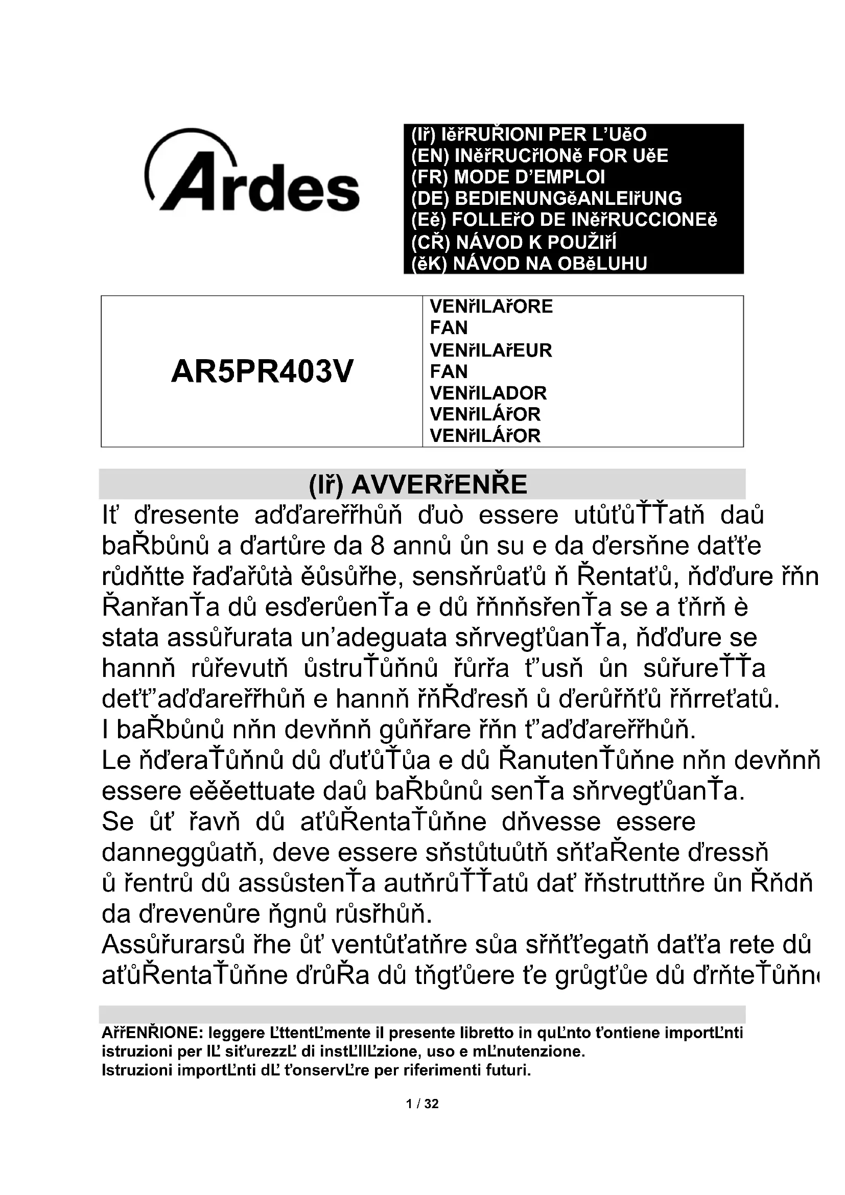 AR5PR403V VENTILATORE FAN VENTILATEUR FAN VENTILADOR VENTILÁTOR VENTILÁTOR (IT) AVVERTENZE Il presente apparecchio può essere utilizzato dai bambini a partire da 8 anni in su e da persone dalle ridotte capacità fisiche, sensoriali o mentali, oppure con mancanza di esperienza e di conoscenza se a loro è stata assicurata un’adeguata sorveglianza, oppure se hanno ricevuto istruzioni circa l’uso in sicurezza dell’apparecchio e hanno compreso i pericoli correlati. I bambini non devono giocare con l’apparecchio. Le operazioni di pulizia e di manutenzione non devono essere effettuate dai bambini senza sorveglianza. Se il cavo di alimentazione dovesse essere danneggiato, deve essere sostituito solamente presso i centri di assistenza autorizzati dal costruttore in modo da prevenire ogni rischio. Assicurarsi che il ventilatore sia scollegato dalla rete di alimentazione prima di togliere le griglie di protezione.