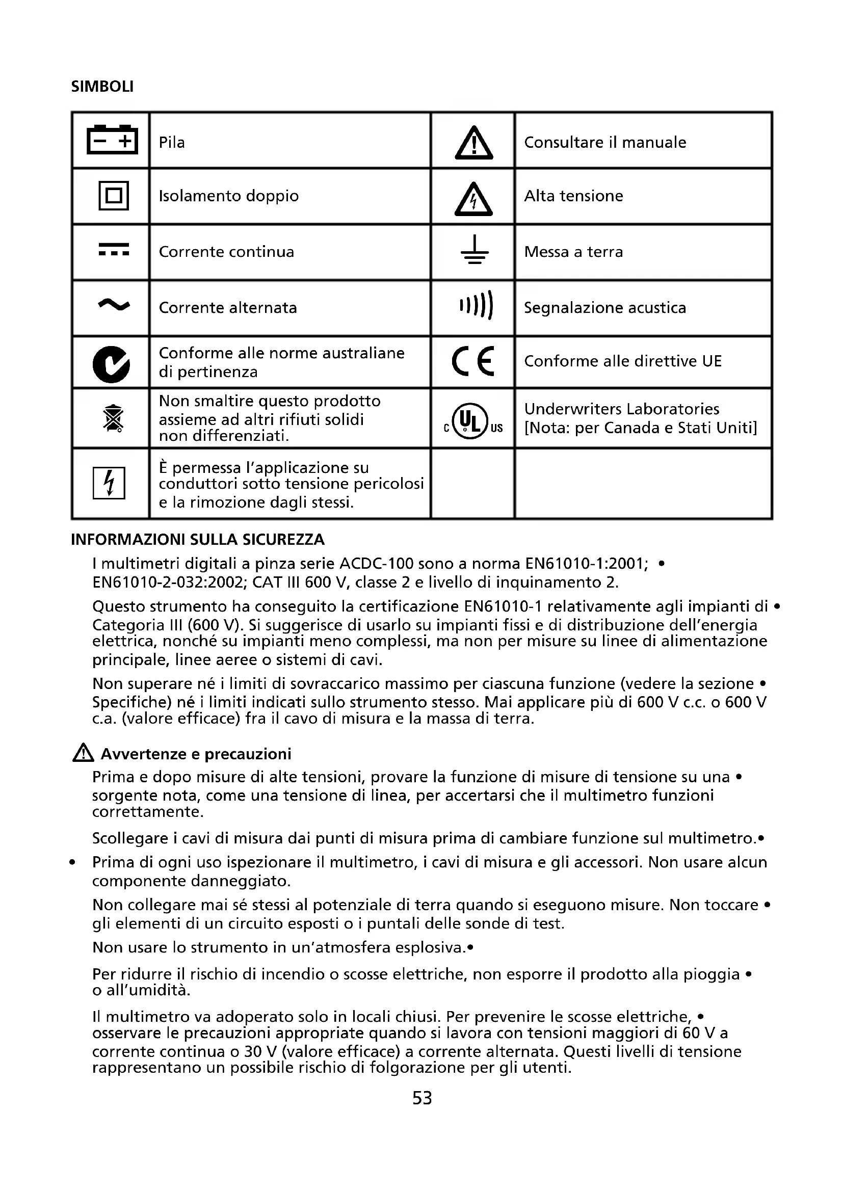 I multimetri digitali a pinza serie ACDC-100 sono a norma EN61010-1:2001; • EN61010-2-032:2002; CAT III 600 V, classe 2 e livello di inquinamento 2. Questo strumento ha conseguito la certificazione EN61010-1 relativamente agli impianti di • Categoria III (600 V). Si suggerisce di usarlo su impianti fissi e di distribuzione dell’energia elettrica, nonché su impianti meno complessi, ma non per misure su linee di alimentazione principale, linee aeree o sistemi di cavi. Non superare né i limiti di sovraccarico massimo per ciascuna funzione (vedere la sezione • Specifiche) né i limiti indicati sullo strumento stesso. Mai applicare più di 600 V c.c. o 600 V c.a. (valore efficace) fra il cavo di misura e la massa di terra. Avvertenze e precauzioni Prima e dopo misure di alte tensioni, provare la funzione di misure di tensione su una • sorgente nota, come una tensione di linea, per accertarsi che il multimetro funzioni correttamente. Scollegare i cavi di misura dai punti di misura prima di cambiare funzione sul multimetro.• Prima di ogni uso ispezionare il multimetro, i cavi di misura e gli accessori. Non usare alcun • componente danneggiato. Non collegare mai sé stessi al potenziale di terra quando si eseguono misure. Non toccare • gli elementi di un circuito esposti o i puntali delle sonde di test. Non usare lo strumento in un’atmosfera esplosiva.• Per ridurre il rischio di incendio o scosse elettriche, non esporre il prodotto alla pioggia • o all’umidità. Il multimetro va adoperato solo in locali chiusi. Per prevenire le scosse elettriche, • osservare le precauzioni appropriate quando si lavora con tensioni maggiori di 60 V a corrente continua o 30 V (valore efficace) a corrente alternata. Questi livelli di tensione rappresentano un possibile rischio di folgorazione per gli utenti.54 Prima e dopo misure di alte tensioni, provare la funzione di misure di tensione su una • sorgente nota, come una tensione di linea, per accertarsi che il multimetro funzioni correttamente. Tenere le mani o le dita dietro le apposite nervature, che indicano il limite di prossimità in • sicurezza al multimetro e ai cavi di misura durante le misure. Prima di usare lo strumento ispezionare i cavi di misura, i connettori e le sonde per rilevare • eventuali danni all’isolamento o metallo esposto. Se si riscontrano difetti, rimediarvi immediatamente. Il multimetro è concepito per l’uso su conduttori sotto tensione non isolati. Nelle • situazioni in cui i componenti sotto tensione sono facilmente accessibili, indossare dispositivi di protezione personale. Procedere con estrema cautela quando: si eseguono misure di tensioni > 20 V o di correnti • > 10 mA su linee di alimentazione in corrente alternata con carichi induttivi o durante temporali, misure di corrente se il fusibile è intervenuto in un circuito con tensione a circuito aperto > 1000 V, e durante la manutenzione di apparecchi con tubi a raggi catodici (CRT). Prima di aprire l’involucro per sostituire le pile, scollegare i cavi di misura.• Prima di eseguire una misura di resistenza o di capacità oppure una prova di continuità o • di un diodo, scollegare l’alimentazione dal circuito e fare scaricare tutti i condensatori ad alta tensione. Per evitare errori di lettura, che potrebbero comportare il rischio di folgorazione e altri • infortuni, sostituire le pile non appena si visualizza l’indicatore di pila scarica ().