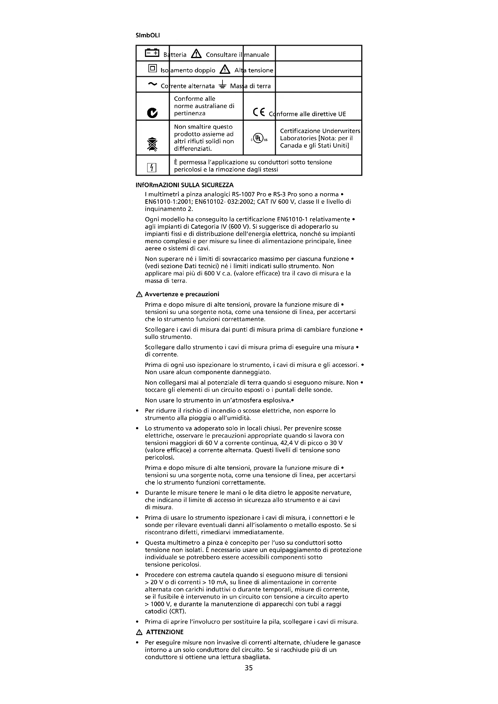 È permessa l’applicazione su conduttori sotto tensione pericolosi e la rimozione dagli stessi INfORmAZIONI SULLA SICUREZZA I multimetri a pinza analogici RS-1007 Pro e RS-3 Pro sono a norma • EN61010-1:2001; EN610102- 032:2002; CAT IV 600 V, classe II e livello di inquinamento 2. Ogni modello ha conseguito la certificazione EN61010-1 relativamente • agli impianti di Categoria IV (600 V). Si suggerisce di adoperarlo su impianti fissi e di distribuzione dell’energia elettrica, nonché su impianti meno complessi e per misure su linee di alimentazione principale, linee aeree o sistemi di cavi. Non superare né i limiti di sovraccarico massimo per ciascuna funzione • (vedi sezione Dati tecnici) né i limiti indicati sullo strumento. Non applicare mai più di 600 V c.a. (valore efficace) tra il cavo di misura e la massa di terra. Avvertenze e precauzioni Prima e dopo misure di alte tensioni, provare la funzione misure di • tensioni su una sorgente nota, come una tensione di linea, per accertarsi che lo strumento funzioni correttamente. Scollegare i cavi di misura dai punti di misura prima di cambiare funzione • sullo strumento. Scollegare dallo strumento i cavi di misura prima di eseguire una misura • di corrente. Prima di ogni uso ispezionare lo strumento, i cavi di misura e gli accessori. • Non usare alcun componente danneggiato. Non collegarsi mai al potenziale di terra quando si eseguono misure. Non • toccare gli elementi di un circuito esposti o i puntali delle sonde. Non usare lo strumento in un’atmosfera esplosiva.• Per ridurre il rischio di incendio o scosse elettriche, non esporre lo • strumento alla pioggia o all’umidità. Lo strumento va adoperato solo in locali chiusi. Per prevenire scosse • elettriche, osservare le precauzioni appropriate quando si lavora con tensioni maggiori di 60 V a corrente continua, 42,4 V di picco o 30 V (valore efficace) a corrente alternata. Questi livelli di tensione sono pericolosi. Prima e dopo misure di alte tensioni, provare la funzione misure di • tensioni su una sorgente nota, come una tensione di linea, per accertarsi che lo strumento funzioni correttamente. Durante le misure tenere le mani o le dita dietro le apposite nervature, • che indicano il limite di accesso in sicurezza allo strumento e ai cavi di misura. Prima di usare lo strumento ispezionare i cavi di misura, i connettori e le • sonde per rilevare eventuali danni all’isolamento o metallo esposto. Se si riscontrano difetti, rimediarvi immediatamente. Questa multimetro a pinza è concepito per l’uso su conduttori sotto • tensione non isolati. È necessario usare un equipaggiamento di protezione individuale se potrebbero essere accessibili componenti sotto tensione pericolosi. Procedere con estrema cautela quando si eseguono misure di tensioni • > 20 V o di correnti > 10 mA, su linee di alimentazione in corrente alternata con carichi induttivi o durante temporali, misure di corrente, se il fusibile è intervenuto in un circuito con tensione a circuito aperto > 1000 V, e durante la manutenzione di apparecchi con tubi a raggi catodici (CRT). Prima di aprire l’involucro per sostituire la pila, scollegare i cavi di misura.• ATTENZIONE Per eseguire misure non invasive di correnti alternate, chiudere le ganasce • intorno a un solo conduttore del circuito. Se si racchiude più di un conduttore si ottiene una lettura sbagliata.36 ATTENZIONE Prima di eseguire misure, verificare che il dispositivo di bloccaggio dell’ago • sia disinserito.
