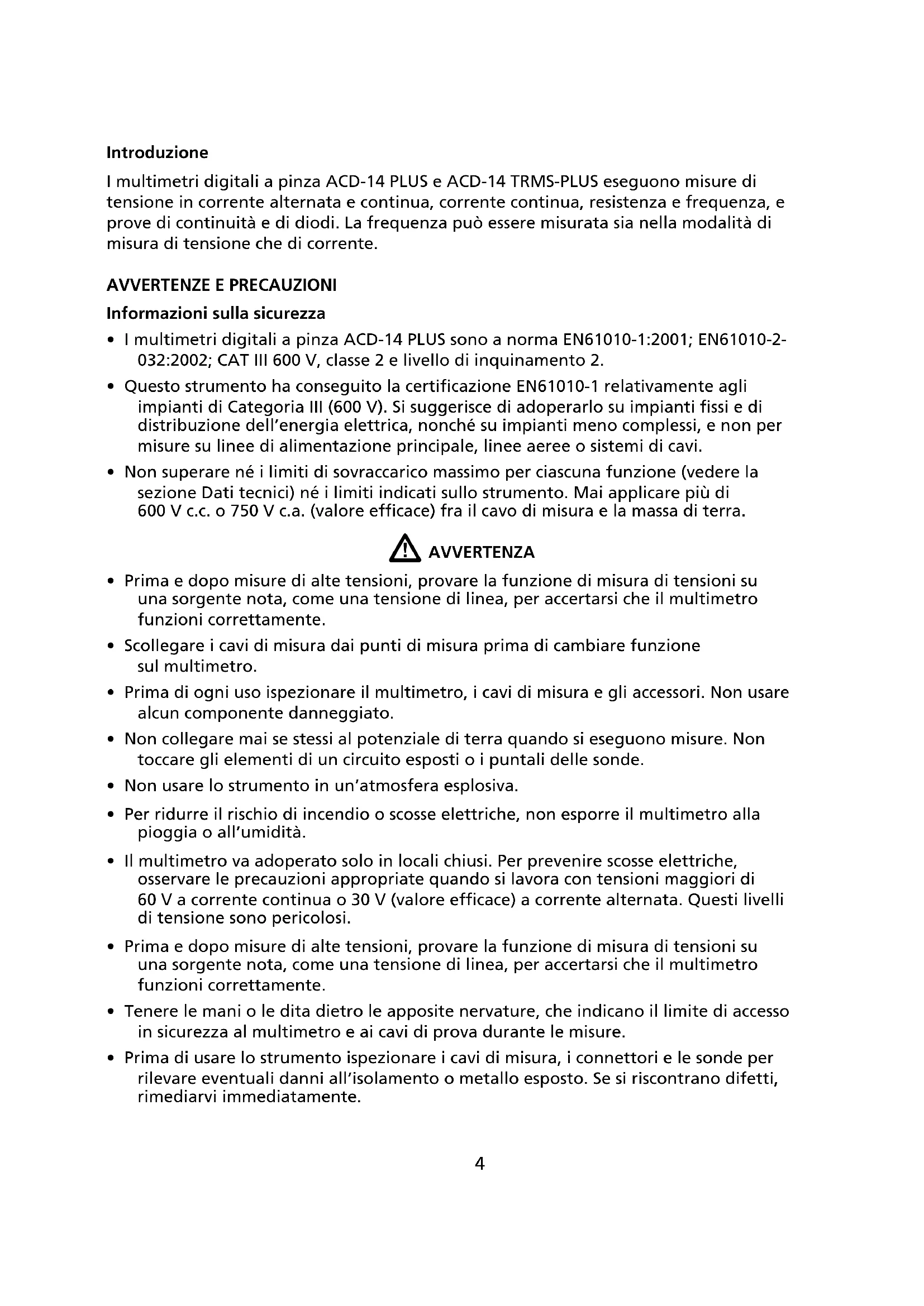 Non smaltire questo prodotto assieme ad altri rifiuti solidi non differenziati.4 Introduzione I multimetri digitali a pinza ACD-14 PLUS e ACD-14 TRMS-PLUS eseguono misure di tensione in corrente alternata e continua, corrente continua, resistenza e frequenza, e prove di continuità e di diodi. La frequenza può essere misurata sia nella modalità di misura di tensione che di corrente.