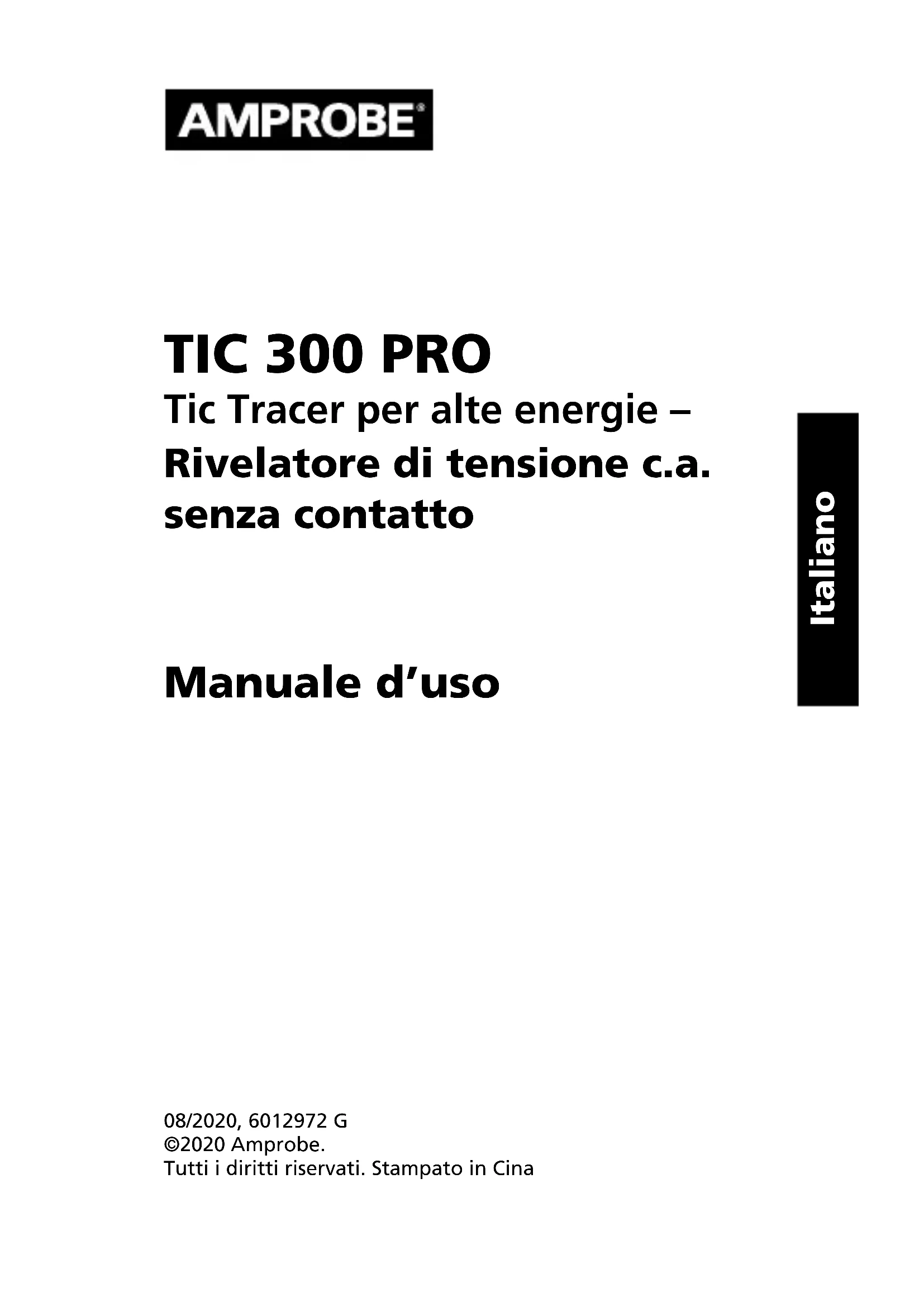 Korea (KCC): Geräte der Klasse A (Industrielle Rundfunk- und Kommunikationsgeräte) [1] [1] Dieses Produkt erfüllt die Anforderungen an mit elektromagnetischen Wellen arbeitende Geräte für industrielle Umgebungen (Klasse A). Dies ist vom Verkäufer oder Anwender zu beachten. Dieses Gerät ist zur Verwendung in gewerblichen Umgebungen ausgelegt und darf nicht in Wohnumgebungen verwendet werden.11 Elektrisch: Empfindlichkeit: typisch gemäß Tabelle unten. LOW-Spannung Spannung (Phase-Erde) Erkennungs bereich Durchschnitt 30 V 3,8 cm 75 V 16,5 cm 100 V 21,6 cm 120 V 25,4 cm 220 V 33 cm 500 V 48,3 cm 1000 V 86,4 cm HIGH-Spannung Spannung (Phase-Erde) Erkennungs bereich Durchschnitt 1,5 kV 12,7 mm 2,0 kV 25,4 mm 4,0 kV 5,1 cm 10,0 kV 20,3 cm 15,0 kV 35,6 cm 20,0 kV 50,8 cm 25,0 kV 66 cmTIC 300 PRO Tic Tracer per alte energie – Rivelatore di tensione c.a. senza contatto Manuale d’uso 08/2020, 6012972 G ©2020 Amprobe. Tutti i diritti riservati. Stampato in Cina ItalianoGaranzia limitata e limitazione di responsabilità Questo prodotto Amprobe sarà esente da difetti di materiale e fabbricazione per un anno a decorrere dalla data di acquisto. Sono esclusi da questa garanzia i fusibili, le pile monouso e i danni causati da incidenti, negligenza, uso improprio, alterazione, contaminazione o condizioni anomale di funzionamento o manipolazione. I rivenditori non sono autorizzati a offrire nessun’altra garanzia a nome della Amprobe. Per richiedere un intervento durante il periodo di garanzia, restituire il prodotto, allegando la ricevuta di acquisto, a un centro di assistenza autorizzato Amprobe Test Tools oppure a un rivenditore o distributore Amprobe locale. Per ulteriori informazioni vedere la sezione Riparazioni. QUESTA GARANZIA È IL SOLO RICORSO A DISPOSIZIONE DELL’ACQUIRENTE, E SOSTITUISCE QUALSIASI ALTRA GARANZIA, ESPRESSA, IMPLICITA O PREVISTA DALLA LEGGE, COMPRESA, MA NON A TITOLO ESCLUSIVO, QUALSIASI GARANZIA IMPLICITA DI COMMERCIABILITÀ O DI IDONEITÀ PER SCOPI PARTICOLARI. IL PRODUTTORE NON SARÀ RESPONSABILE DI DANNI O PERDITE SPECIALI, INDIRETTI O ACCIDENTALI, DERIVANTI DA QUALSIASI CAUSA O TEORIA. Poiché alcuni stati o paesi non permettono l’esclusione o la limitazione di una garanzia implicita o di danni accidentali o indiretti, questa limitazione di responsabilità potrebbe non riguardare l’acquirente. Riparazioni A tutti gli strumenti di misura restituiti per interventi in garanzia non coperti dalla garanzia oppure per la taratura, devono essere allegate le seguenti informazioni: il proprio nome e quello dell’azienda, indirizzo, numero telefonico e ricevuta di acquisto. Allegare anche una breve descrizione del problema o dell’intervento richiesto e i cavi di misura. Gli importi dovuti per sostituzioni o riparazioni non coperte dalla garanzia vanno versati tramite assegno, vaglia bancario, carta di credito con data di scadenza, oppure ordine di acquisto all’ordine di Amprobe