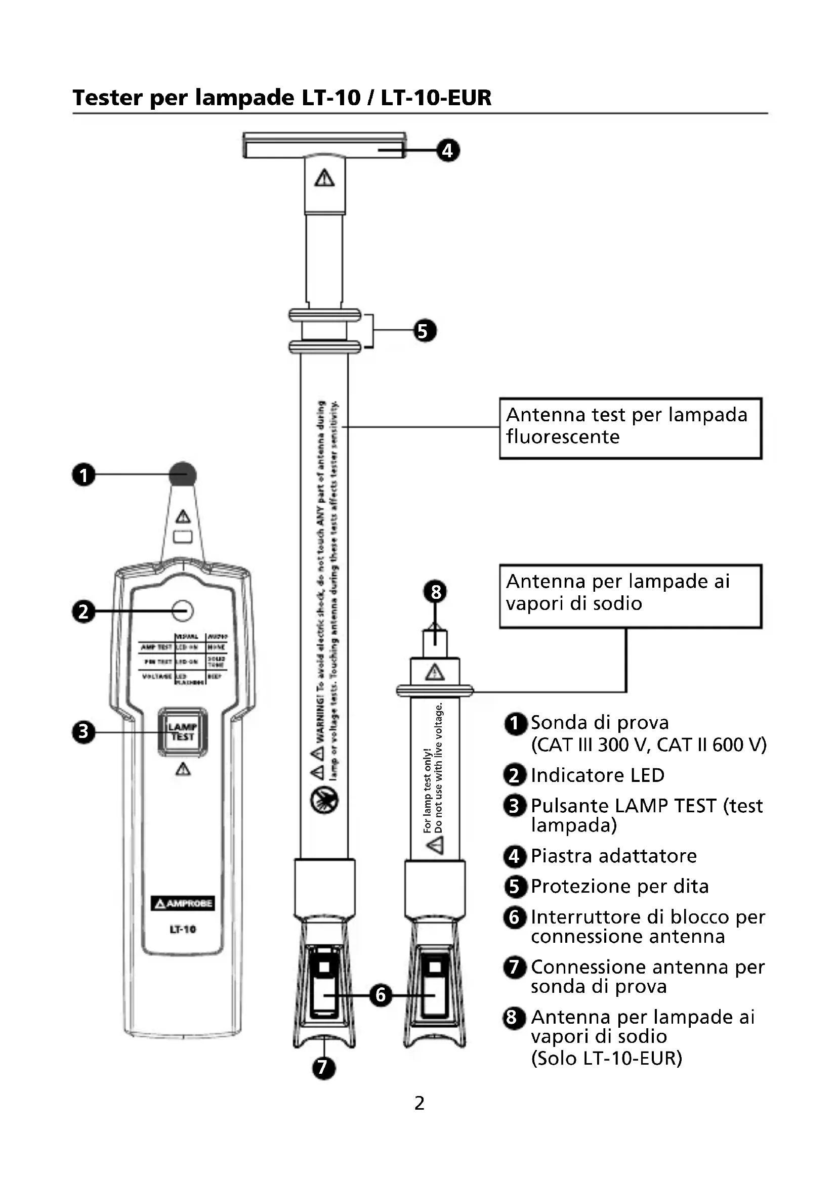Sonda di prova (CAT III 300 V, CAT II 600 V) Indicatore LED Pulsante LAMP TEST (test lampada) Piastra adattatore Protezione per dita Interruttore di blocco per connessione antenna Connessione antenna per sonda di prova Antenna per lampade ai vapori di sodio (Solo LT-10-EUR) Tester per lampade LT-10 / LT-10-EUR For lamp test only! Do not use with live voltage.
