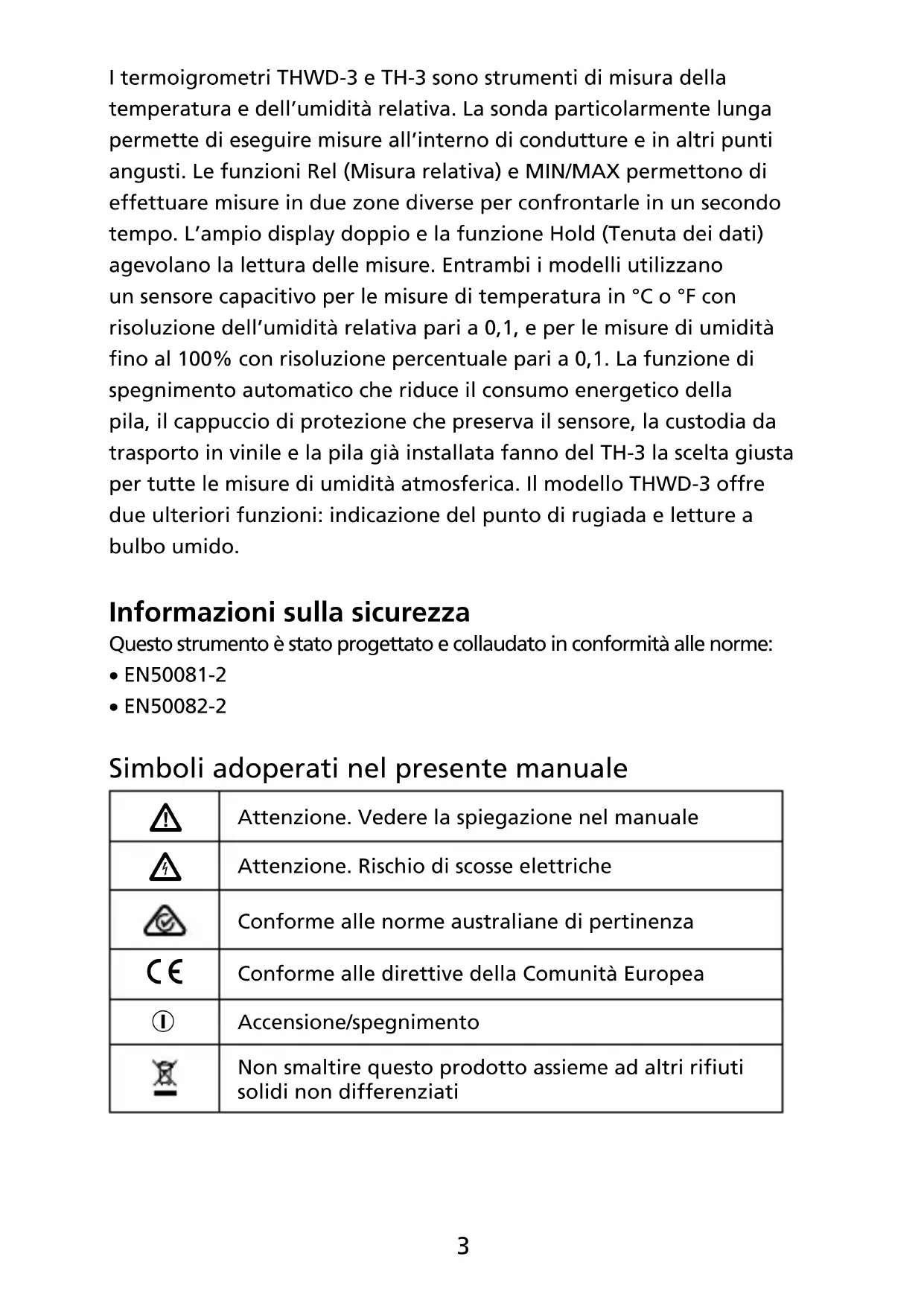 - Per accendere e spegnere il termoigrometro, premere il pulsante . Selezione delle unità di temperatura Quando si accende il termoigrometro per la prima volta, la scala di misura predefinita è in gradi centigradi (°C). Per passare ai gradi Fahrenheit (°F) premere il pulsante . Premerlo di nuovo per tornare ai gradi centigradi. Quando si accende lo strumento la volta successiva, si attiva la scala scelta per ultima. Operazione Hold (Tenuta dei dati) Si può fermare la visualizzazione delle misure sul display premendo il pulsante . Quando i dati non sono più necessari, disattivare la funzione Hold premendo di nuovo il pulsante . Quando il termoigrometro è in questa modalità, i pulsanti , , e sono disattivati. Operazione Rel (Misura relativa) Quando si preme il pulsante , il termoigrometro memorizza la misura attuale. Visualizza quindi la differenza fra la nuova misura e quella memorizzata. Premere di nuovo il pulsante per uscire dalla modalità di misura relativa. Operazione MIN/MAX Quando si preme il pulsante , il termoigrometro passa alla modalità , nella quale il valore minimo e il valore massimo vengono tenuti in memoria contemporaneamente e aggiornati con ogni nuova misura. Quando si preme il pulsante , il display visualizza l’indicatore e il valore massimo; premendolo di nuovo, il display visualizza l’indicatore MIN e il valore minimo. Premendolo una terza volta si fanno lampeggiare i due indicatori simultaneamente; ciò indica che i dati in memoria sono stati aggiornati e che le misure visualizzate corrispondono alla temperatura e all’umidità attuali. Quando il termoigrometro è nella modalità , i pulsanti e sono disattivati. Per uscire dalla modalità MIN/ MAX, premere e mantenere premuto MIN MAX per due secondi.5 Temperatura a bulbo umido e del punto di rugiada (solo il modello THWD-3) Quando viene acceso, lo strumento visualizza la temperatura ambiente. Per visualizzare la temperatura del punto di rugiada (DP), premere una volta DP WB . Premere di nuovo DP WB per passare alla misura della temperatura a bulbo umido (WB). Premendo la terza volta DP WB si riporta il termoigrometro alla modalità di misura della temperatura ambiente. Il display indica se è selezionata la misura di temperatura del punto di rugiada o a bulbo umido. Spegnimento automatico Come impostazione predefinita, all’accensione del termoigrometro si attiva la modalità di spegnimento automatico: se per 30 minuti non si preme alcun pulsante, lo strumento si spegne automaticamente. Per disattivare la funzione di spegnimento automatico, premere e mantenere premuto il pulsante e quindi accendere lo strumento; il simbolo dello spegnimento automatico scompare dal display. Pila scarica Quando la tensione della pila è inferiore ai requisiti di funzionamento, il display visualizza il simbolo e la pila deve essere sostituita. Misure di temperatura a bulbo umido (TH-3) Di tanto in tanto può essere necessario eseguire misure di temperatura a bulbo umido. A tal fine, usare il TH-3 come indicato di seguito.