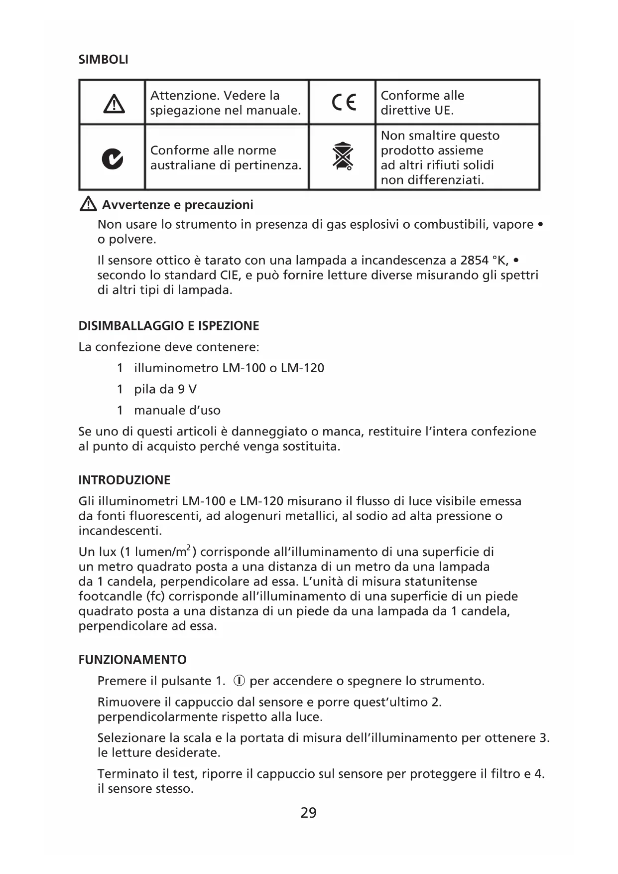 ) corrisponde all’illuminamento di una superficie di un metro quadrato posta a una distanza di un metro da una lampada da 1 candela, perpendicolare ad essa. L’unità di misura statunitense footcandle (fc) corrisponde all’illuminamento di una superficie di un piede quadrato posta a una distanza di un piede da una lampada da 1 candela, perpendicolare ad essa. FUNZIONAMENTO Premere il pulsante 1. per accendere o spegnere lo strumento. Rimuovere il cappuccio dal sensore e porre quest’ultimo 2. perpendicolarmente rispetto alla luce. Selezionare la scala e la portata di misura dell’illuminamento per ottenere 3. le letture desiderate. Terminato il test, riporre il cappuccio sul sensore per proteggere il filtro e 4. il sensore stesso.30 Funzione Lx / fc Scale di misura dell’illuminamento. 1 fc = 10,764 lux; 1 lux = 0,09290 fc. Hold (Mantenimento dei dati) Ferma la lettura presente sul display quando si preme il pulsante. Per disabilitare la funzione Hold, premere di nuovo il pulsante. Selezione manuale della portata (LM-100) Premere il pulsante di selezione manuale della portata per ottenere le letture desiderate. Selezione automatica/manuale della portata (LM-120) Premere il pulsante di selezione automatica o manuale della portata per ottenere le letture desiderate. AUTO è la modalità predefinita. Funzione MIN MAX (LM-120) Una volta premuto il pulsante corrispondente, la funzione MIN MAX aggiorna il display in modo da visualizzare il valore massimo o minimo misurato. Premendo il pulsante per meno di un secondo si attiva la funzione di visualizzazione della lettura massima, minima o effettiva. Ogni volta che si preme questo pulsante, il misuratore passa dalla funzione MAX alla funzione MIN, alla disattivazione. Per disabilitare la funzione MIN MAX, tenere premuto il pulsante per più di 1 secondo. Selezionare la portata appropriata prima di abilitare questa funzione. Spegnimento automatico (LM-120) Per conservare la carica della pila, l’illuminometro si spegne automaticamente dopo circa 6 minuti di inattività. Lo si può riaccendere premendo il pulsante . È possibile disabilitare la funzione di spegnimento automatico tenendo premuto il pulsante HOLD mentre si accende lo strumento. Azzeramento (LM-120) Con il tempo, lo zero del sensore ottico cambia. Per ripristinarlo, coprire il sensore e premere il pulsante ZERO. Il display visualizza “ADJ” per indicare la regolazione in corso. Completato il ripristino, il display indica “00,0”. SPECIFICHE Generali: Frequenza di campionamento: 2,5 volte al secondo per il display digitale Display: A cristalli liquidi, 3½ cifre (1999 conteggi) Sensore: Fotodiodo al silicio e filtro Ambiente: Funzionamento in locali chiusi Altitudine: Fino a 2000 m Temperatura e umidità: Esercizio: Da -10 °C a 50 °C; dallo 0 all’80% di umidità relativa31 Immagazzinaggio: Da -10 °C a 50 °C; dallo 0% al 70% di umidità relativa Alimentazione: Una pila da 9 V, NEDA 1604, IEC 6F22, JIS 006P Autonomia della pila: 200 ore Spegnimento automatico: Dopo circa 6 minuti Dimensioni (base): 130 x 63 x 38 mm Dimensioni (sensore): 80 x 55 x 29 mm Peso: 220 g pila inclusa Compatibilità elettromagnetica: EN61326-1. Questo prodotto risponde ai requisiti delle seguenti direttive della Comunità Europea: 89/336/CEE (compatibilità elettromagnetica) e 73/23/CEE (basse tensioni) modificate dalla direttiva 93/68/CEE (marchio CE). Tuttavia, rumore elettrico o campi elettromagnetici intensi vicino all’apparecchio possono disturbare il circuito di misura. Gli strumenti di misura rispondono anche a segnali indesiderati, eventualmente presenti nel circuito di misura. Gli utenti devono esercitare cautela e prendere le opportune precauzioni per evitare risultati falsi quando si eseguono misure in presenza di interferenze elettroniche. Illuminamento: Portata: 20, 200, 2000, 20000, 200000 lux 20, 200, 2000, 20000 fc Precisione: ± 3% (taratura con lampada a incandescenza standard a 2854 °K) 6% per altre fonti di luce visibile Deviazione angolare dalla curva coseno 30 ° ± 2% 60 ° ± 6% 80 ° ± 25% Correzione angolare del coseno secondo le norme JIS C 1609:1993 e CNS 5119, specificazione generale in classe A.