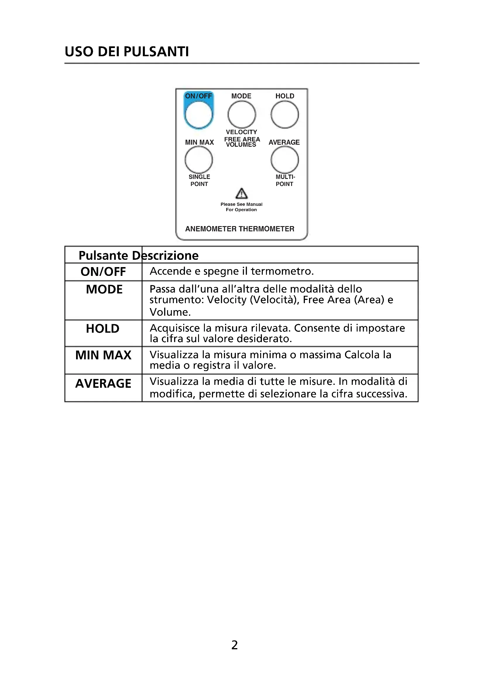 MIN MAX AVERAGE SINGLEPOINTMULTI-POINT ANEMOMETER THERMOMETER Pulsante Descrizione ON/OFF Accende e spegne il termometro. MODE Passa dall’una all’altra delle modalità dello strumento: Velocity (Velocità), Free Area (Area) e Volume. HOLD Acquisisce la misura rilevata. Consente di impostare la cifra sul valore desiderato. MIN MAX Visualizza la misura minima o massima Calcola la media o registra il valore. AVERAGE Visualizza la media di tutte le misure. In modalità di modifica, permette di selezionare la cifra successiva.3