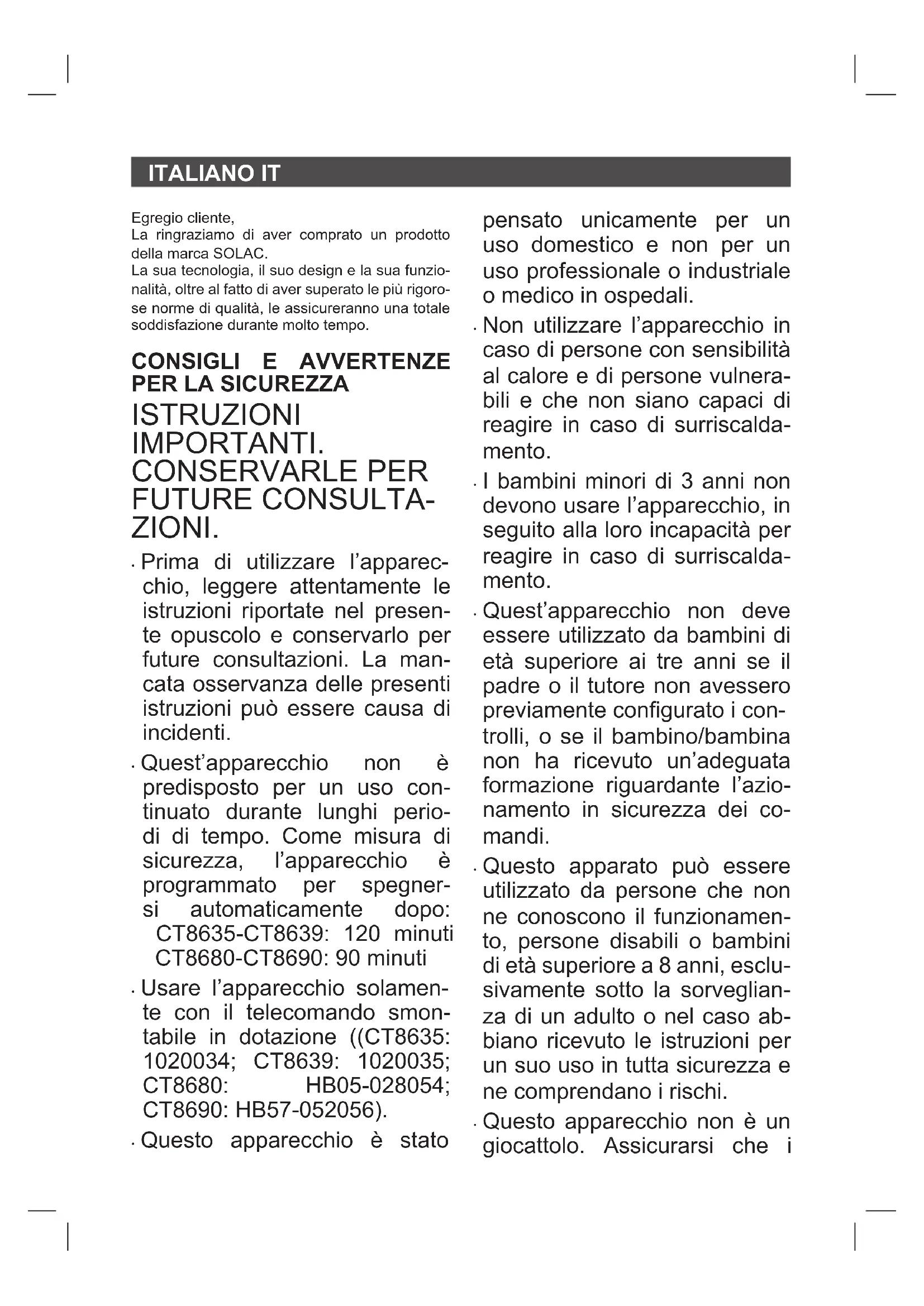 - Come misura di sicurezza, quest’apparecchio è programmato per spegnersi automatica- mente dopo 120 min (CT8635- CT8639) e 90 min. (CT8680 – CT8690) di uso continuato. Se l’apparato si spegne in questo modo, azionare nuovamente il pulsante di accensione (a) affin- ché torni a scaldare.