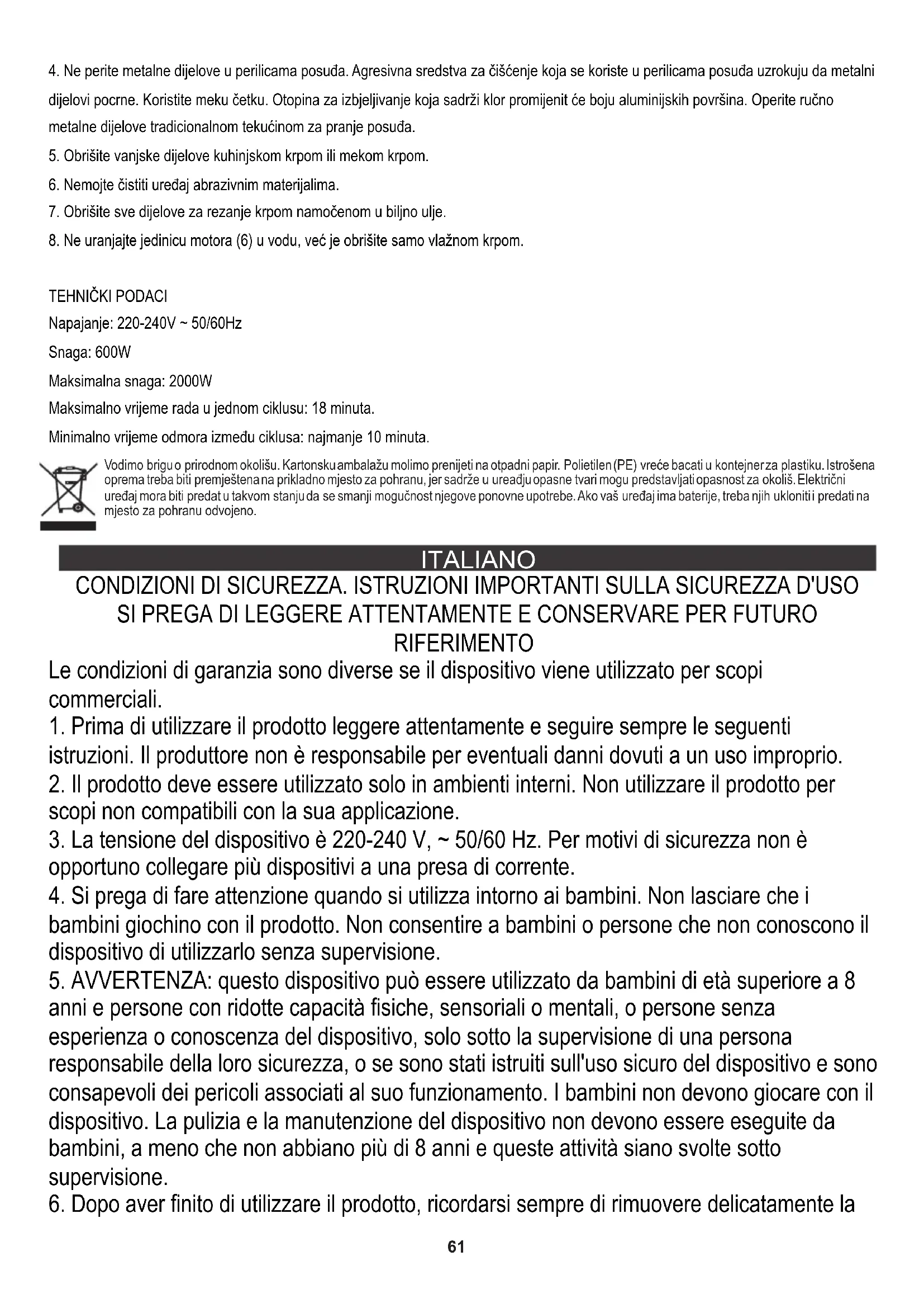DATI TECNICI Alimentazione: 220-240V ~50/60Hz Potenza: 600 W Potenza massima: 2000 W Tempo massimo di funzionamento in un ciclo: 18 minuti. Tempo minimo di riposo tra i cicli: almeno 10 minuti. Prendersi cura dell'ambiente Gli imballi di cartone devono essere smaltiti nel contenitore per la carta. I sacchetti di polietilene (PE) vanno gettati nel contenitore per la plastica. L'apparecchio usato deve essere rottamato presso un centro di raccolta autorizzato, poiché contiene elementi pericolosi che potrebbero costituire una minaccia per l'ambiente. I dispositivi elettrici devono essere resi al fine di evitare il loro riutilizzo. Se il dispositivo contiene una batteria, deve essere rimossa e smaltita separatamente in un punto di raccolta. Non gettare l'apparecchio nei contenitori dei rifiuti urbani!