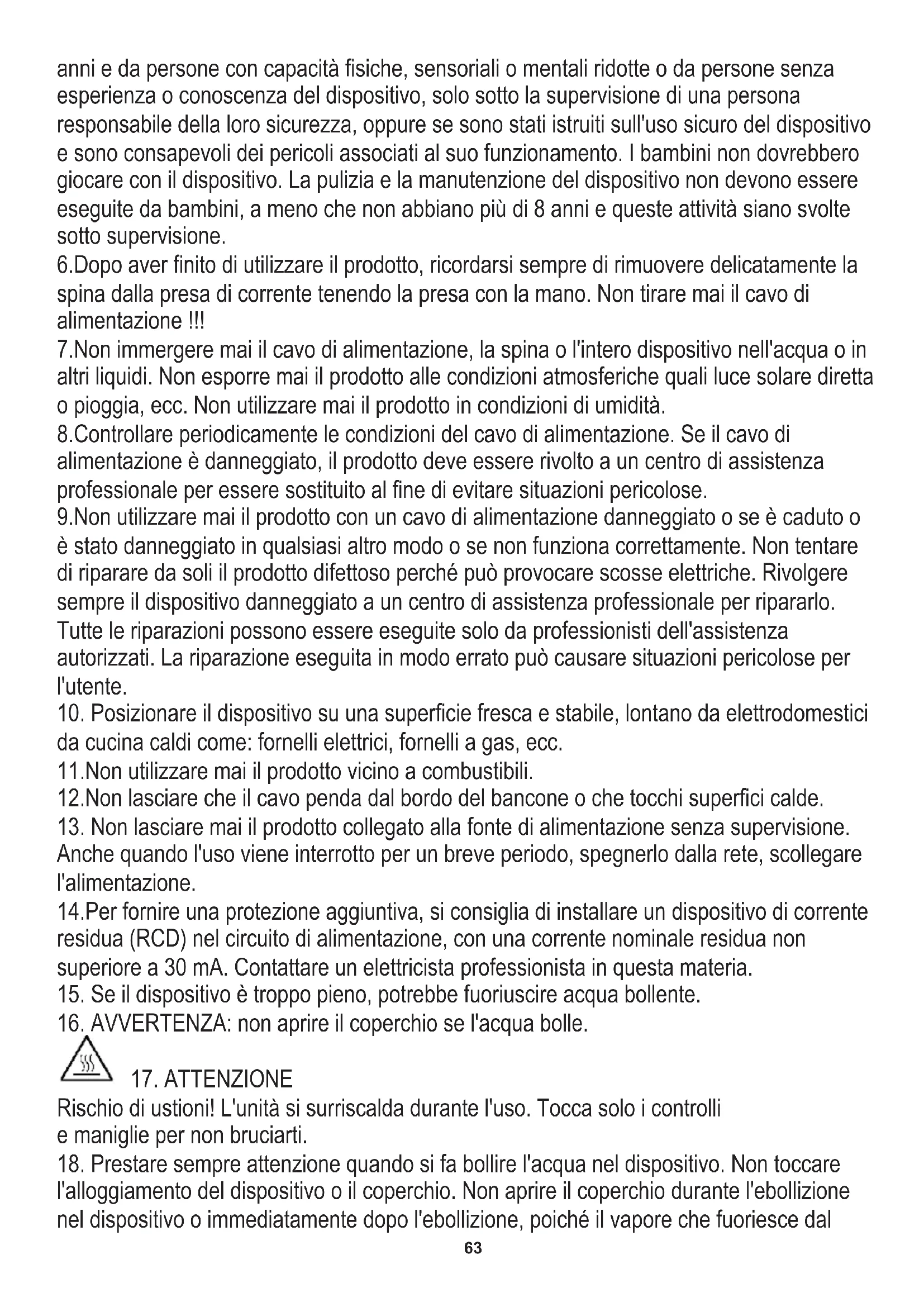 15. Se il dispositivo è troppo pieno, potrebbe fuoriuscire acqua bollente.