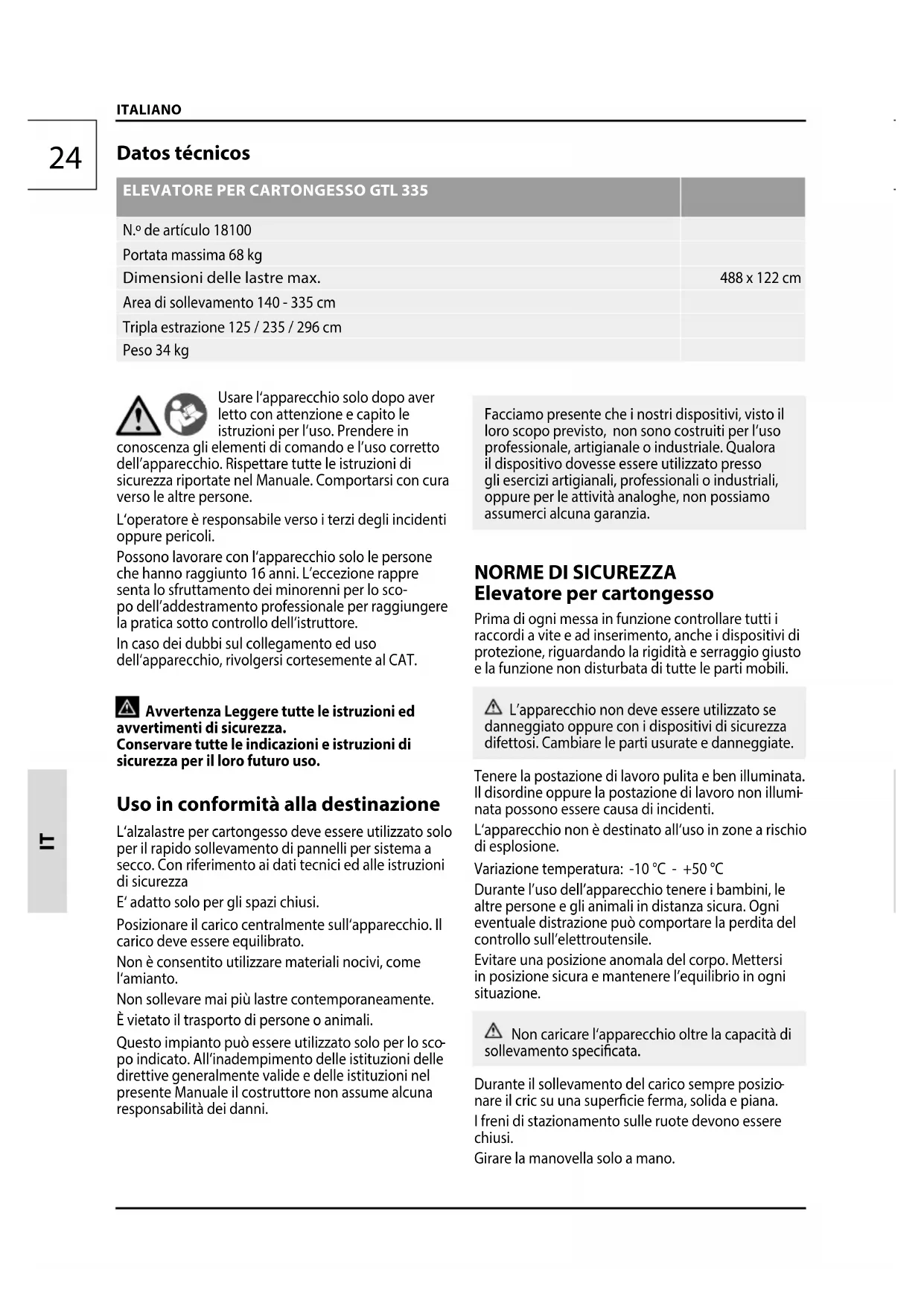 N.º de artículo 18100 Portata massima 68 kg Dimensioni delle lastre max. 488 x 122 cm Area di sollevamento 140 - 335 cm Tripla estrazione 125 / 235 / 296 cm Peso 34 kg Usare l‘apparecchio solo dopo aver letto con attenzione e capito le istruzioni per l‘uso. Prendere in conoscenza gli elementi di comando e l’uso corretto dell’apparecchio. Rispettare tutte le istruzioni di sicurezza riportate nel Manuale. Comportarsi con cura verso le altre persone. L‘operatore è responsabile verso i terzi degli incidenti oppure pericoli. Possono lavorare con l‘apparecchiosolo le persone che hannoraggiunto 16 anni. L’eccezionerappre