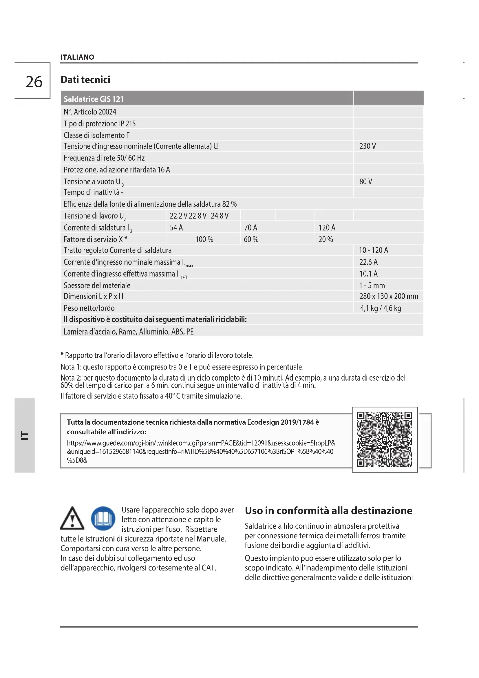 Uso in conformità alla destinazione Saldatrice a lo continuo in atmosfera protettiva per connessione termica dei metalli ferrosi tramite fusione dei bordi e aggiunta di additivi. Questo impianto può essere utilizzato solo per lo scopo indicato. All‘inadempimento delle istituzioni delle direttive generalmente valide e delle istituzioni Usare l‘apparecchio solo dopo aver letto con attenzione e capito le istruzioni per l‘uso. Rispettare tutte le istruzioni di sicurezza riportate nel Manuale. Comportarsi con cura verso le altre persone. In caso dei dubbi sul collegamento ed uso dell‘apparecchio, rivolgersi cortesemente al CAT. ITALIANO Dati tecnici Saldatrice GIS 121 N°. Articolo 20024 Tipo di protezione IP 21S Classe di isolamento F Tensione d‘ingresso nominale (Corrente alternata) U