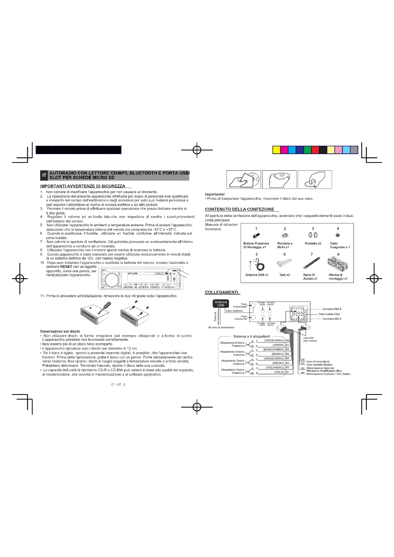 DAB+ Sensibilità utilizzabile (-30 dB) Rapporto segnale-rumore Separazione sterea Sezione lettore CD/USB/MICRO SD/MP3 Rapporto segnale/rumore Separazione Distorsione Risposta in frequenza BLUETOOTH Versione del Bluetooth: Bluetooth: Potenza RF (radiofrequenza) irradiata: 12V DC (consentito11-16V) 4 ohms 40W x 4 ±10 dB Bassi a 100 Hz Alti a 10 kHz Circa 175 x 178 x 50 mm (prof./largh./alt.) 87.5-108 (MHz) 174.928-239.2 MHz 12 dBuV 50 dB 30 dB 50 dB 40 dB <0.5%