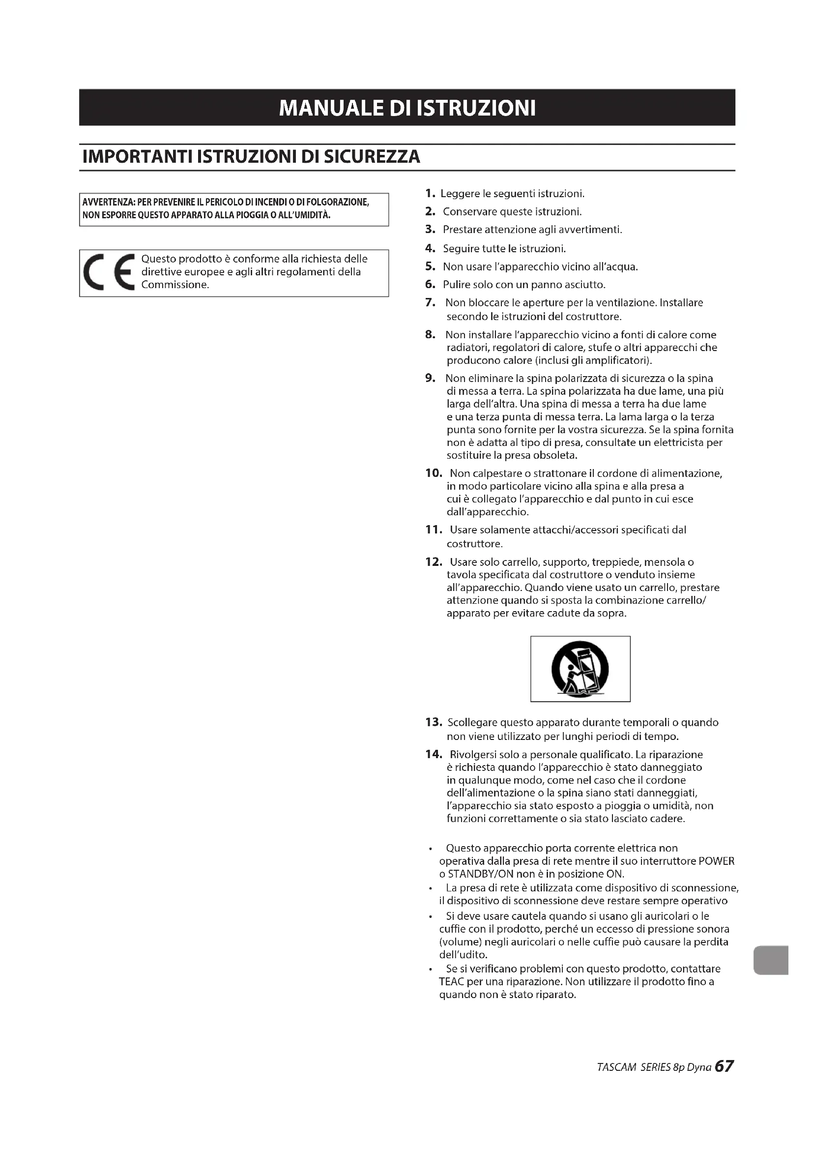CAUTELA La mancata osservanza di queste istruzioni potrebbe provocare lesioni. Precauzioni per il posizionamento e l’uso p La gamma di temperatura di funzionamento di questa unità è 0-40 °C. p Non installare l’unità nei seguenti luoghi. Si potrebbe peggiorare la qualità del suono o causare malfunzionamenti. Luoghi con forti vibrazioni In prossimità di finestre o altri luoghi esposti alla luce diretta del sole Nei pressi di caloriferi o altri luoghi estremamente caldi Luoghi troppo freddi In luoghi molto umidi o scarsamente ventilati Ambienti molto polverosi p Per una buona dissipazione di calore, non appoggiare nulla sulla parte superiore dell’unità. p Non posizionare l’unità su di un amplificatore di potenza o altro dispositivo che genera calore. Attenzione alla condensa Potrebbe verificarsi condensa se l’unità viene spostata da un luogo freddo a uno caldo o è utilizzata subito dopo che una stanza fredda è stata riscaldata o è comunque esposta a un improvviso cambiamento di temperatura. Per prevenire questo, o se questo accade, lasciare l’unità per una o due ore alla nuova temperatura ambiente prima dell’uso. Pulizia dell’unità Usare un panno morbido e asciutto per pulire l’unità. Non pulire con panni chimici di pulizia, diluenti, alcool o altri agenti chimici. Ciò potrebbe danneggiare la superficie o causare scolorimento. Uso del sito TEAC Global È possibile scaricare questo manuale di istruzioni e il manuale di riferimento necessari per questa unità dal sito TEAC Global (http://teac-global.com/). Nella sezione TASCAM Download, selezionare la lingua desiderata per aprire la pagina Download per quella lingua.TASCAM SERIES 8p Dyna