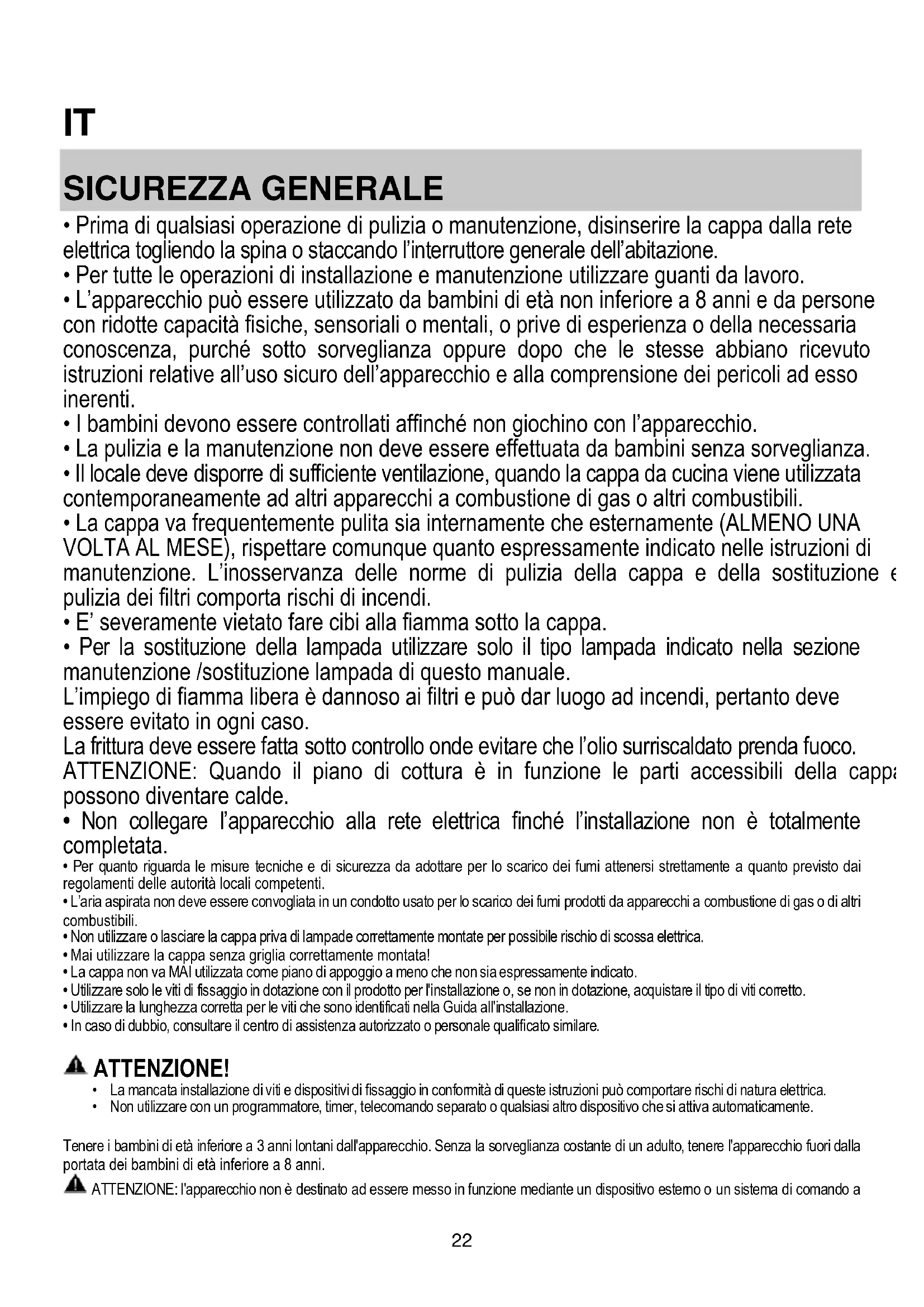 - Per la sostituzione della lampada utilizzare solo il tipo lampada indicato nella sezione manutenzione /sostituzione lampada di questo manuale. L’impiego di fiamma libera è dannoso ai filtri e può dar luogo ad incendi, pertanto deve essere evitato in ogni caso. La frittura deve essere fatta sotto controllo onde evitare che l’olio surriscaldato prenda fuoco. ATTENZIONE: Quando il piano di cottura è in funzione le parti accessibili della cappa possono diventare calde.