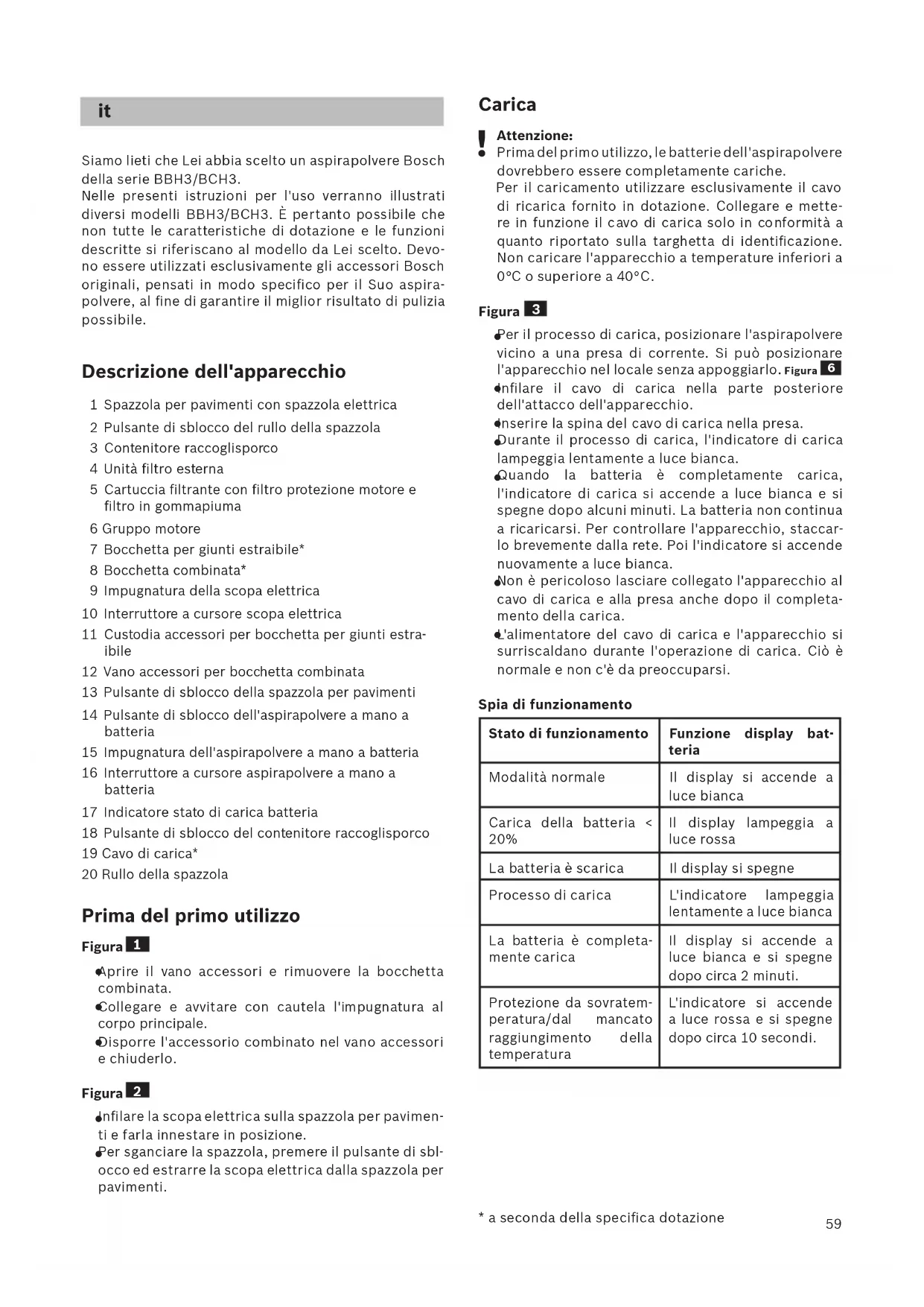 Siamo lieti che Lei abbia scelto un aspirapolvere Bosch della se rie BBH3/BCH3. Nelle presenti istruzioni per l'uso verranno illustrati diversi modelli BBH3/BCH3. È pertanto possibile che non tutte le caratteristiche di dotazione e le funzioni descritte si riferiscano al modello da Lei scelto. Devo- no essere utilizzati esclusivamente gli accessori Bosch originali, pensati in modo specifico per il Suo aspira- polvere, al fine di garantire il miglior risultato di pulizia possibile. Descrizione dell'apparecchio 1 Spazzola per pavimenti con spazzola elettrica 2 Pulsante di sblocco del rullo della spazzola 3 Contenitore raccoglisporco 4 Unità filtro esterna 5 Cartuccia filtrante con filtro protezione motore e filtro in gommapiuma 6 Gruppo motore 7 Bocchetta per giunti estraibile* 8 Bocchetta combinata* 9 Impugnatura della scopa elettrica 10 Interruttore a cursore scopa elettrica 11 Custodia accessori per bocchetta pe r giunti estra- ibile 12 Vano accessori per bocchetta combinata 13 Pulsante di sblocco della spazzola per pavimenti 14 Pulsante di sblocco dell'aspirapolvere a mano a batteria 15 Impugnatura dell'aspirapolvere a mano a batteria 16 Interruttore a cursore aspirapolvere a mano a batteria 17 Indicatore stato di carica batteria 18 Pulsante di sblocco del contenitore raccoglisporco 19 Cavo di carica* 20 Rullo della spazzola Prima del primo utilizzo Figura