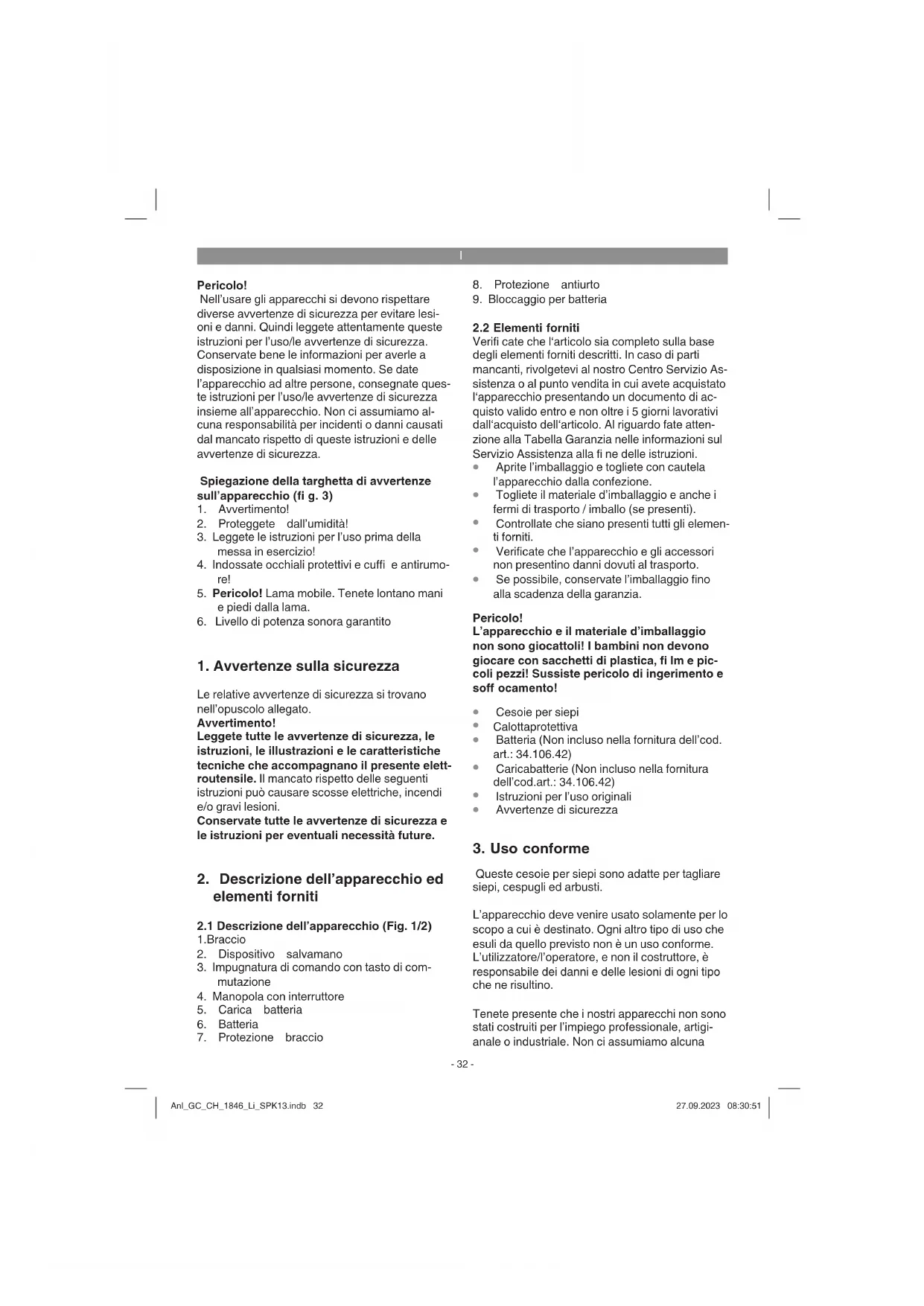 Queste cesoie per siepi sono adatte per tagliare siepi, cespugli ed arbusti. L’apparecchio deve venire usato solamente per lo scopo a cui è destinato. Ogni altro tipo di uso che esuli da quello previsto non è un uso conforme. L’utilizzatore/l’operatore, e non il costruttore, è responsabile dei danni e delle lesioni di ogni tipo che ne risultino. Tenete presente che i nostri apparecchi non sono stati costruiti per l’impiego professionale, artigi- anale o industriale. Non ci assumiamo alcuna Anl_GC_CH_1846_Li_SPK13.indb 32Anl_GC_CH_1846_Li_SPK13.indb 32 27.09.2023 08:30:5127.09.2023 08:30:51I