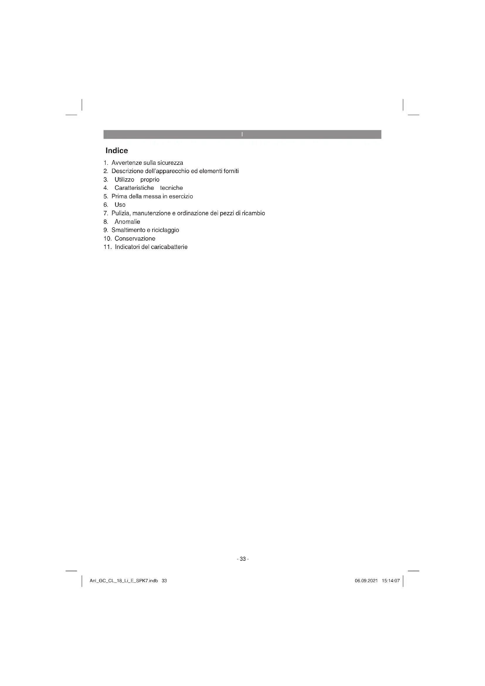 Stato indicatori Signifi cato e interventi LED rosso LED verde Spento Lampeggia Pronto all’esercizio Il caricabatterie è collegato alla rete e pronto per l‘uso, la batteria non è nel caricabatterie. Acceso Spento Ricarica Il caricabatterie ricarica la batteria in esercizio di ricarica veloce. Per i rela- tivi tempi di ricarica si veda direttamente sul caricabatterie. Avvertenza! In base alla carica residua della batteria i tempi di ricarica ef- fettivi possono variare leggermente da quelli indicati. Spento Acceso La batteria è ricaricata e pronta per l’uso. Poi l’apparecchio passa alla ricarica lenta fi no a completare il processo. A tale scopo lasciate la batteria collegata al caricabatterie per altri 15 min. Intervento: Togliete la batteria dal caricabatterie. Staccate il caricabatterie dalla rete. Lampeggia Spento Regolatore di carica Il caricabatterie si trova nella modalità di ricarica lenta. In questo modo la batteria viene ricaricata più lentamente per motivi di si- curezza e la ricarica richiede più tempo. Ciò può essere dovuto ai seguenti motivi: - La batteria non è stata ricaricata per molto tempo. - La temperatura della batteria non si trova nel range ideale. Intervento: Attendete la fi ne della ricarica, si può comunque continuare a ricaricare la batteria. Lampeggia Lampeggia Anomalia La ricarica non è più possibile. La batteria è difettosa. Intervento: Una batteria difettosa non deve più venire ricaricata. Togliete la batteria dal caricabatterie. Acceso Acceso Anomalia termica La batteria è troppo calda (per es. esposizione diretta al sole) o troppo fredda (al di sotto dei 0°C) Intervento: Togliete la batteria e tenetela per un giorno a temperatura ambiente (ca. 20°C). Anl_GC_CL_18_Li_E_SPK7.indb 38Anl_GC_CL_18_Li_E_SPK7.indb 38 06.09.2021 15:14:0806.09.2021 15:14:08I