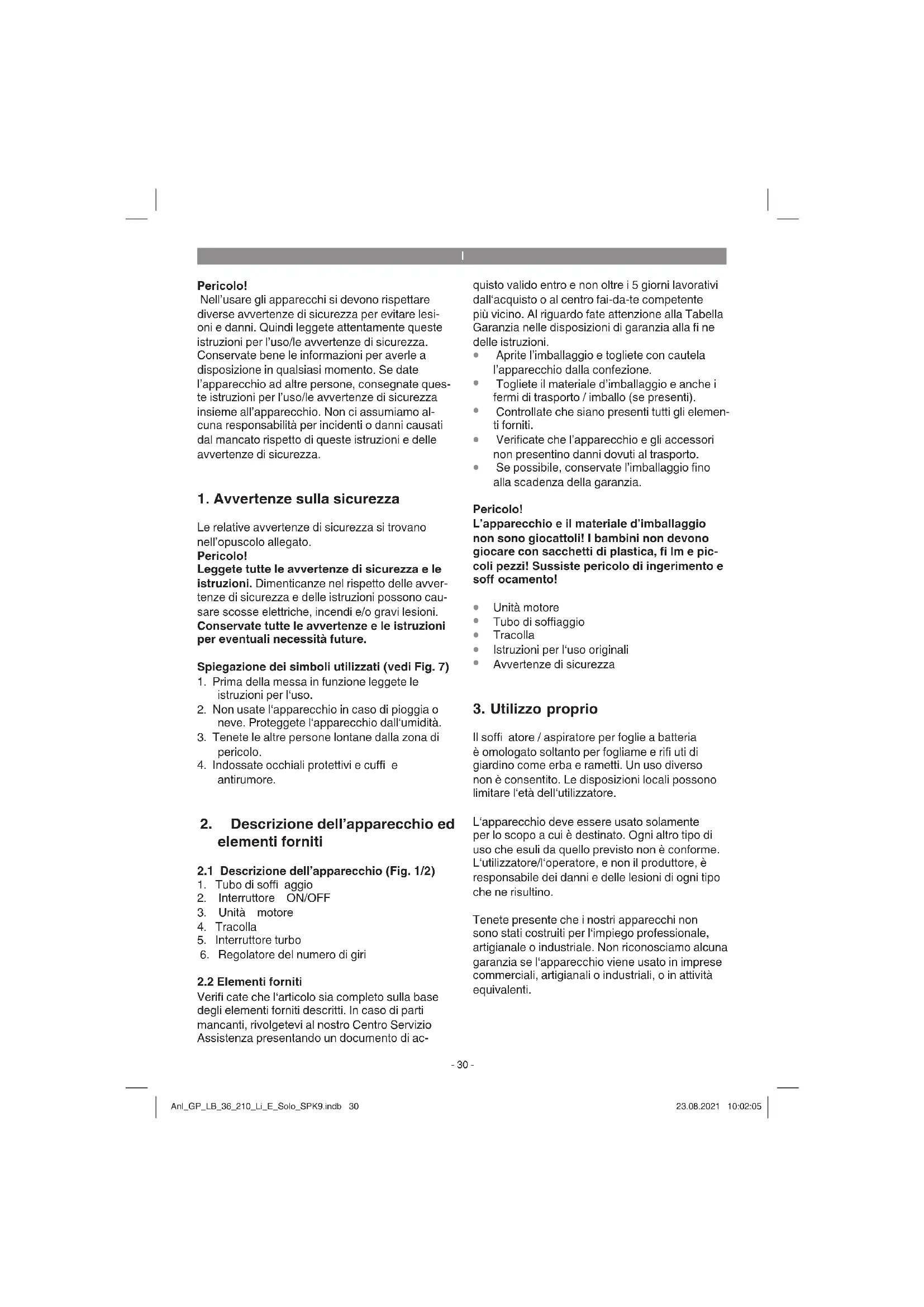 Il soffi atore / aspiratore per foglie a batteria è omologato soltanto per fogliame e rifi uti di giardino come erba e rametti. Un uso diverso non è consentito. Le disposizioni locali possono limitare l‘età dell‘utilizzatore. L‘apparecchio deve essere usato solamente per lo scopo a cui è destinato. Ogni altro tipo di uso che esuli da quello previsto non è conforme. L‘utilizzatore/l‘operatore, e non il produttore, è responsabile dei danni e delle lesioni di ogni tipo che ne risultino. Tenete presente che i nostri apparecchi non sono stati costruiti per l‘impiego professionale, artigianale o industriale. Non riconosciamo alcuna garanzia se l‘apparecchio viene usato in imprese commerciali, artigianali o industriali, o in attività equivalenti. Anl_GP_LB_36_210_Li_E_Solo_SPK9.indb 30Anl_GP_LB_36_210_Li_E_Solo_SPK9.indb 30 23.08.2021 10:02:0523.08.2021 10:02:05I