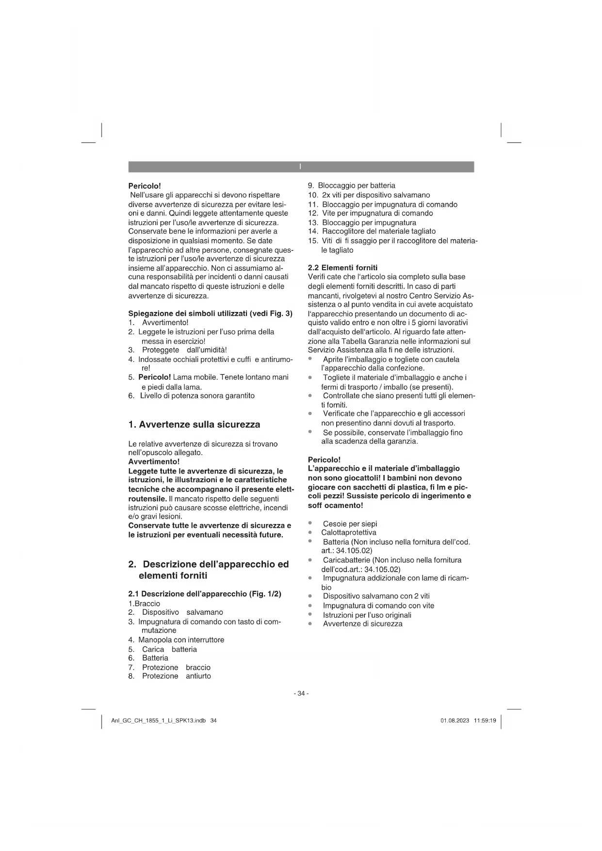 e la batteria al nostro servizio di assistenza clienti. Per un invio corretto contattate il nostro ser- vizio di assistenza clienti o il punto vendita dove avete acquistato l’apparecchio. Nel caso di invio o smaltimento di batterie ovvero di apparecchi a batteria metteteli in sacchetti di plastica separati per evitare cor- tocircuiti e incendi! Per ottenere una lunga durata della batteria si deve provvedere a una puntuale ricarica. Ciò è comunque necessario quando ci si accorge della diminuzione delle prestazioni dell‘apparecchio. Non fate scaricare mai completamente la batteria. Questo potrebbe danneggiarla! Anl_GC_CH_1855_1_Li_SPK13.indb 36Anl_GC_CH_1855_1_Li_SPK13.indb 36 01.08.2023 11:59:2001.08.2023 11:59:20I