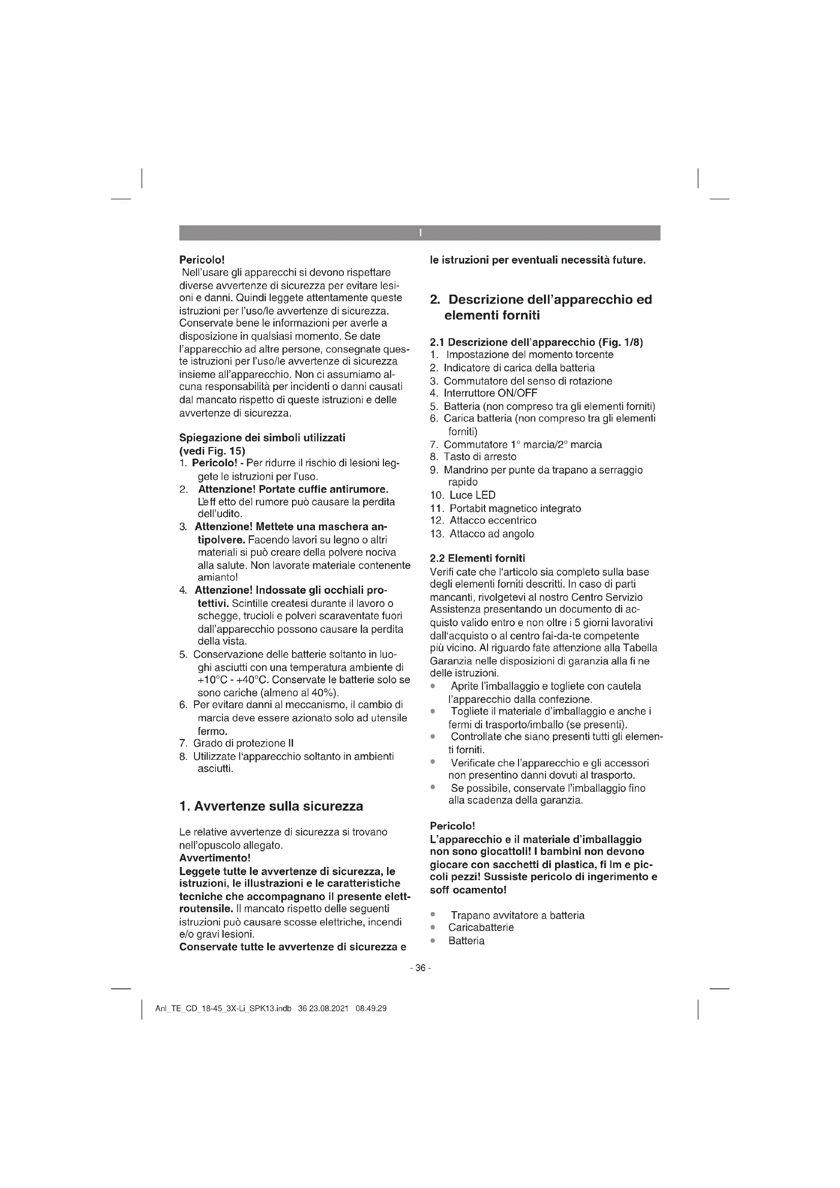 Indossate i guanti. Attenzione! Rischi residui Anche se questo elettroutensile viene utiliz- zato secondo le norme, continuano a sussis- tere rischi residui. In relazione alla struttura e al funzionamento di questo elettroutensile potrebbero presentarsi i seguenti pericoli: Anl_TE_CD_18-45_3X-Li_SPK13.indb 37 23.08.2021 08:49:30I