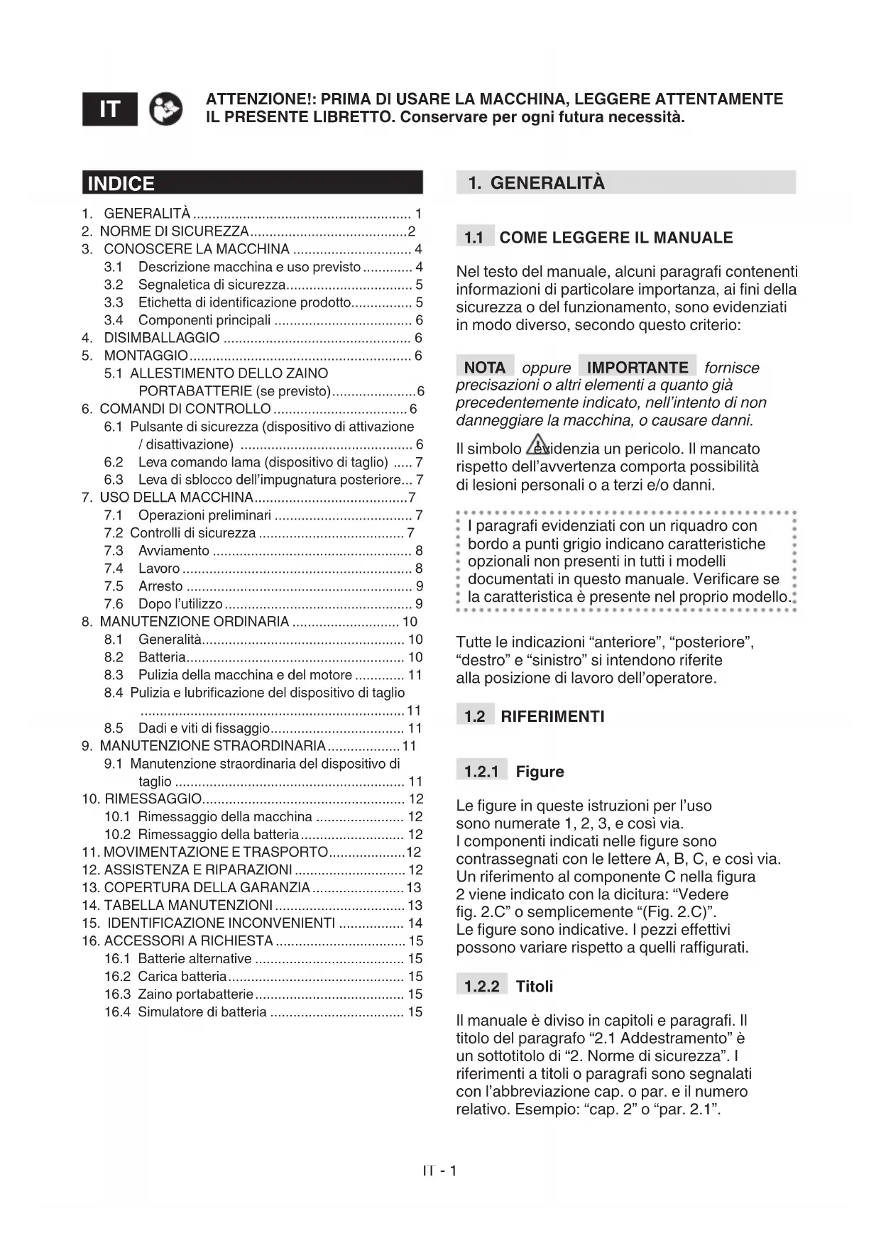Trascrivere i dati di identicazione della macchina negli appositi spazi dell’etichetta riportata nel retro della copertina. IMPORTANTE Utilizzare i dati di identicazione riportati sull’etichetta di identicazione prodotto ogni volta che si contatta l’ocina autorizzata.IT - 7 IMPORTANTE L’esempio della dichiarazione di conformità si trova nelle ultime pagine del manuale. COMPONENTI PRINCIPALI La macchina è costituita dai seguenti componenti principali a cui corrispondono le seguenti funzionalità (Fig.1 ): A. Motore: fornisce il movimento al dispositivo di taglio. B. : è l’elemento preposto al taglio della vegetazione. C. Impugnatura anteriore: permette il governo della macchina e vi è posto l’interruttore di sicurezza. D. Impugnatura posteriore: permette il governo della macchina e vi sono posti i comandi di controllo principali. E. Protezione lama (per il trasporto e la movimentazione della macchina): protegge da contatti involontari con il dispositivo di taglio che possono causare gravi lesioni. F. Batteria (accessorio a richiesta, par. 16.1): dispositivo che fornisce corrente elettrica all’utensile; le sue caratteristiche e norme d’uso sono descritte in uno specico manuale. G. Carica batteria (accessorio a richiesta, par. 16.2): dispositivo che si utilizza per ricaricare la batteria; le sue caratteristiche e norme d’uso sono descritte in uno specico manuale. Sono disponibili due modelli di carica batteria: G1 (carica batteria veloce); G2 (carica batteria standard). Zaino portabatterie (accessorio a richiesta. par.16.3): dispositivo che consente l’alloggiamento delle batterie.