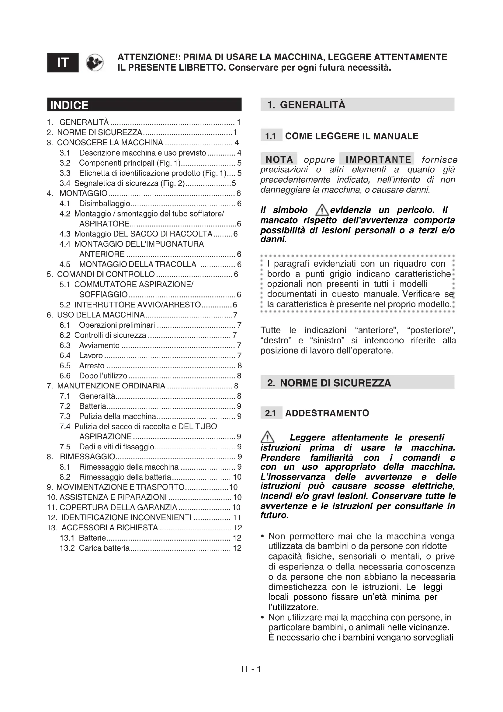 Questa macchina è progettata e costruita per lo spostamento mediante soatura e l'aspirazione/ triturazione di foglie, erba, e detriti vari, di peso contenuto e modeste dimensioni.