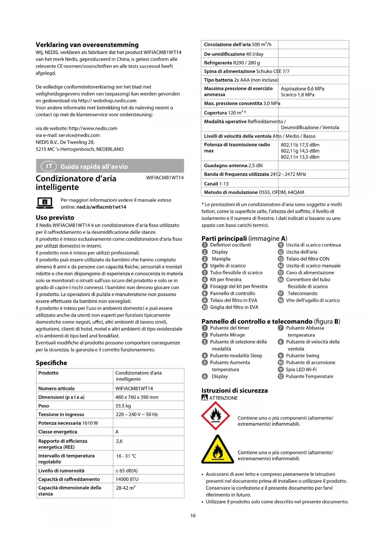 Guida rapida all’avvio Condizionatore d’aria intelligente WIFIACMB1WT14Per maggiori informazioni vedere il manuale esteso online: ned.is/wiacmb1wt14 Uso previsto Il Nedis WIFIACMB1WT14 è un condizionatore d’aria sso utilizzato per il rareddamento e la deumidicazione delle stanze.Il prodotto è inteso esclusivamente come condizionatore d’aria sso per utilizzi domestici in interni.Il prodotto non è inteso per utilizzi professionali.Il prodotto può essere utilizzato da bambini che hanno compiuto almeno 8 anni e da persone con capacità siche, sensoriali e mentali ridotte o che non dispongono di esperienza e conoscenza in materia solo se monitorati o istruiti sull’uso sicuro del prodotto e solo se in grado di capire i rischi connessi. I bambini non devono giocare con il prodotto. Le operazioni di pulizia e manutenzione non possono essere eettuate da bambini non sorvegliati.Il prodotto è inteso per l’uso in ambienti domestici e può essere utilizzato anche da utenti non esperti per funzioni tipicamente domestiche come negozi, uci, altri ambienti di lavoro simili, agriturismi, clienti di hotel, motel e altri ambienti di tipo residenziale e/o ambienti di tipo bed and breakfast.Eventuali modiche al prodotto possono comportare conseguenze per la sicurezza, la garanzia e il corretto funzionamento. Speciche Prodotto Condizionatore d’aria intelligenteNumero articolo WIFIACMB1WT14Dimensioni (p x l x a) 480 x 760 x 390 mmPeso 33.5 kgTensione in ingresso 220 – 240 V ~ 50 HzPotenza necessaria 1610 WClasse energetica ARapporto di ecienza energetica (REE) 2,6 Intervallo di temperatura regolabile16 - 31 °CLivello di rumorosità ≤ 65 dB(A)Capacità di rareddamento 14000 BTUCapacità dimensionale della stanza28-42 m²17
