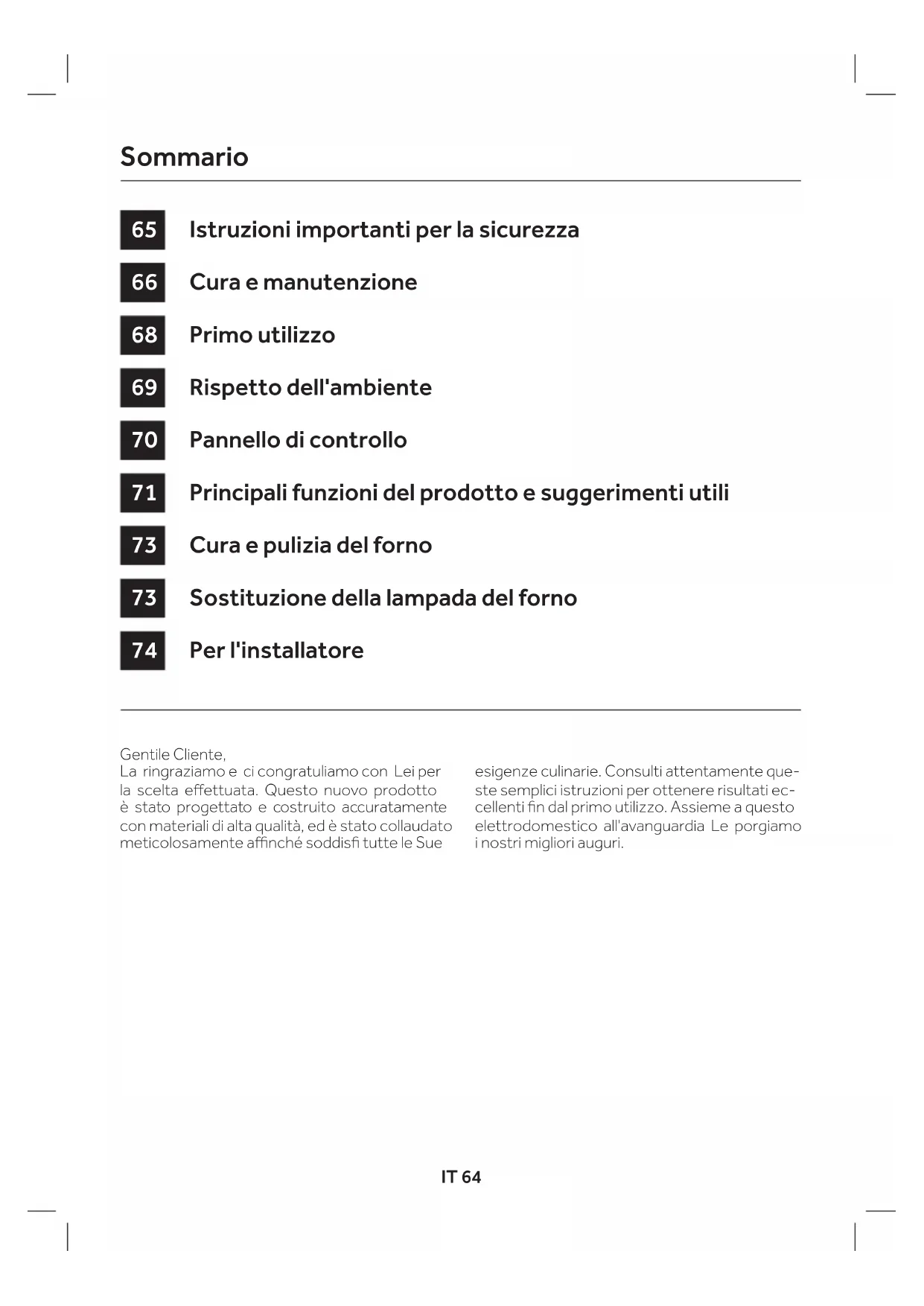 DESCÂBLES SASO H05RR-F 3x1,5 mm² H05RR-F 3x2,5 mm² H05VV-F 3x1,5 mm² H05VV-F 3x2,5 mm² H05RN-F 3x1,5 mm² H05RN-F 3x2,5 mm² H05V2V2-F 3x1,5 mm² H05V2V2-F 3x2,5 mm²IT 64 Gentile Cliente, La ringraziamo e ci congratuliamo con Lei per la scelta eettuata. Questo nuovo prodotto è stato progettato e costruito accuratamente con materiali di alta qualità, ed è stato collaudato meticolosamente anché soddis tutte le Sue esigenze culinarie. Consulti attentamente que- ste semplici istruzioni per ottenere risultati ec- cellenti n dal primo utilizzo. Assieme a questo elettrodomestico all'avanguardia Le porgiamo inostri migliori auguri. Istruzioni importanti per la sicurezza Cura e manutenzione Primo utilizzo Rispetto dell'ambiente Pannello di controllo Principali funzioni del prodotto e suggerimenti utili Cura e pulizia del forno Sostituzione della lampada del forno Per l'installatore