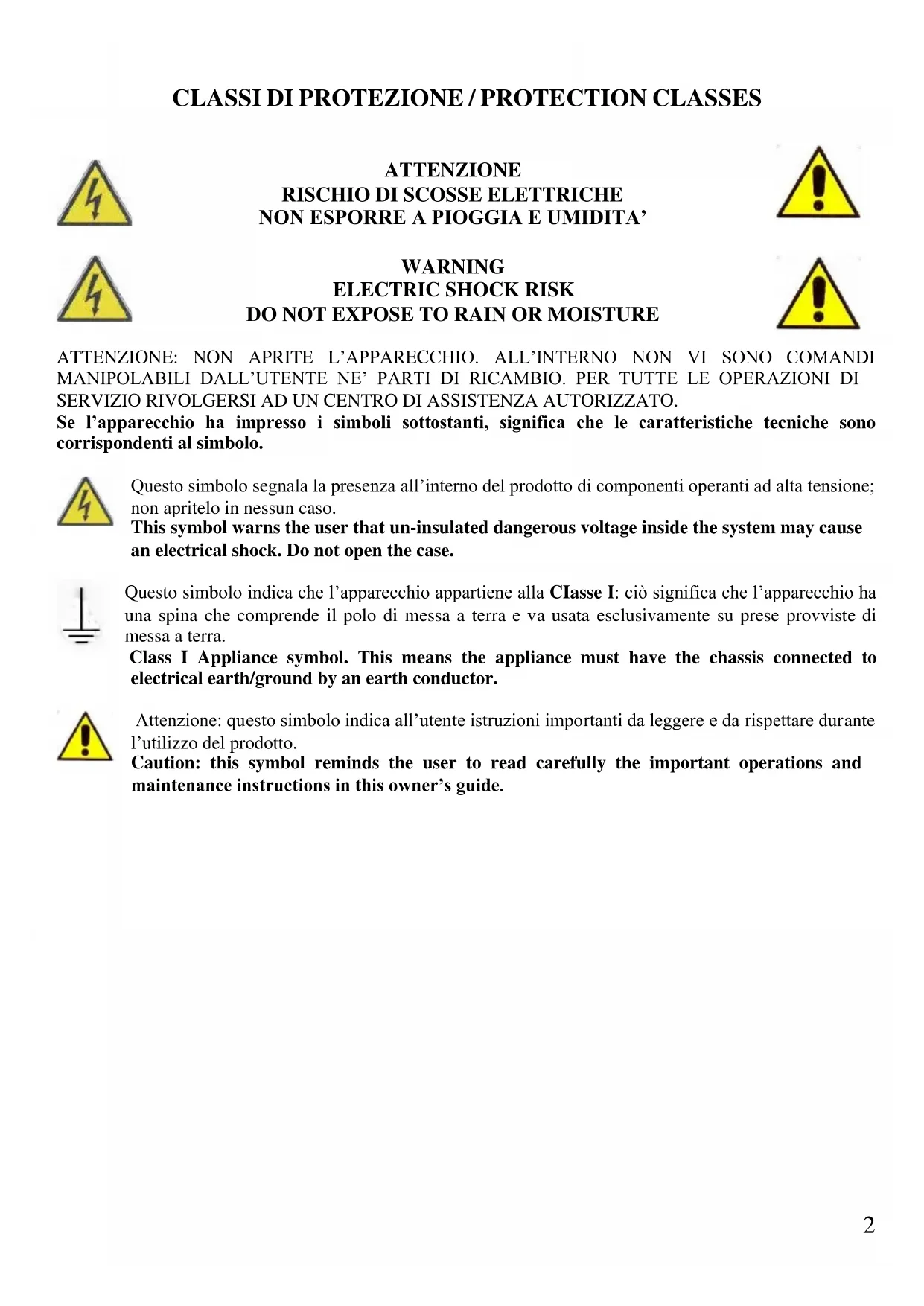 DO NOT EXPOSE TO RAIN OR MOISTURE ATTENZIONE: NON APRITE L’APPARECCHIO. ALL’INTERNO NON VI SONO COMANDI MANIPOLABILI DALL’UTENTE NE’ PARTI DI RICAMBIO. PER TUTTE LE OPERAZIONI DI SERVIZIO RIVOLGERSI AD UN CENTRO DI ASSISTENZA AUTORIZZATO. Se l’apparecchio ha impresso i simboli sottostanti, significa che le caratteristiche tecniche sono corrispondenti al simbolo. Questo simbolo segnala la presenza all’interno del prodotto di componenti operanti ad alta tensione; non apritelo in nessun caso. This symbol warns the user that un-insulated dangerous voltage inside the system may cause an electrical shock. Do not open the case. Questo simbolo indica che l’apparecchio appartiene alla CIasse I: ciò significa che l’apparecchio ha una spina che comprende il polo di messa a terra e va usata esclusivamente su prese provviste di messa a terra. Class I Appliance symbol. This means the appliance must have the chassis connected to electrical earth/ground by an earth conductor. Attenzione: questo simbolo indica all’utente istruzioni importanti da leggere e da rispettare durante l’utilizzo del prodotto. Caution: this symbol reminds the user to read carefully the important operations and maintenance instructions in this owner’s guide.3