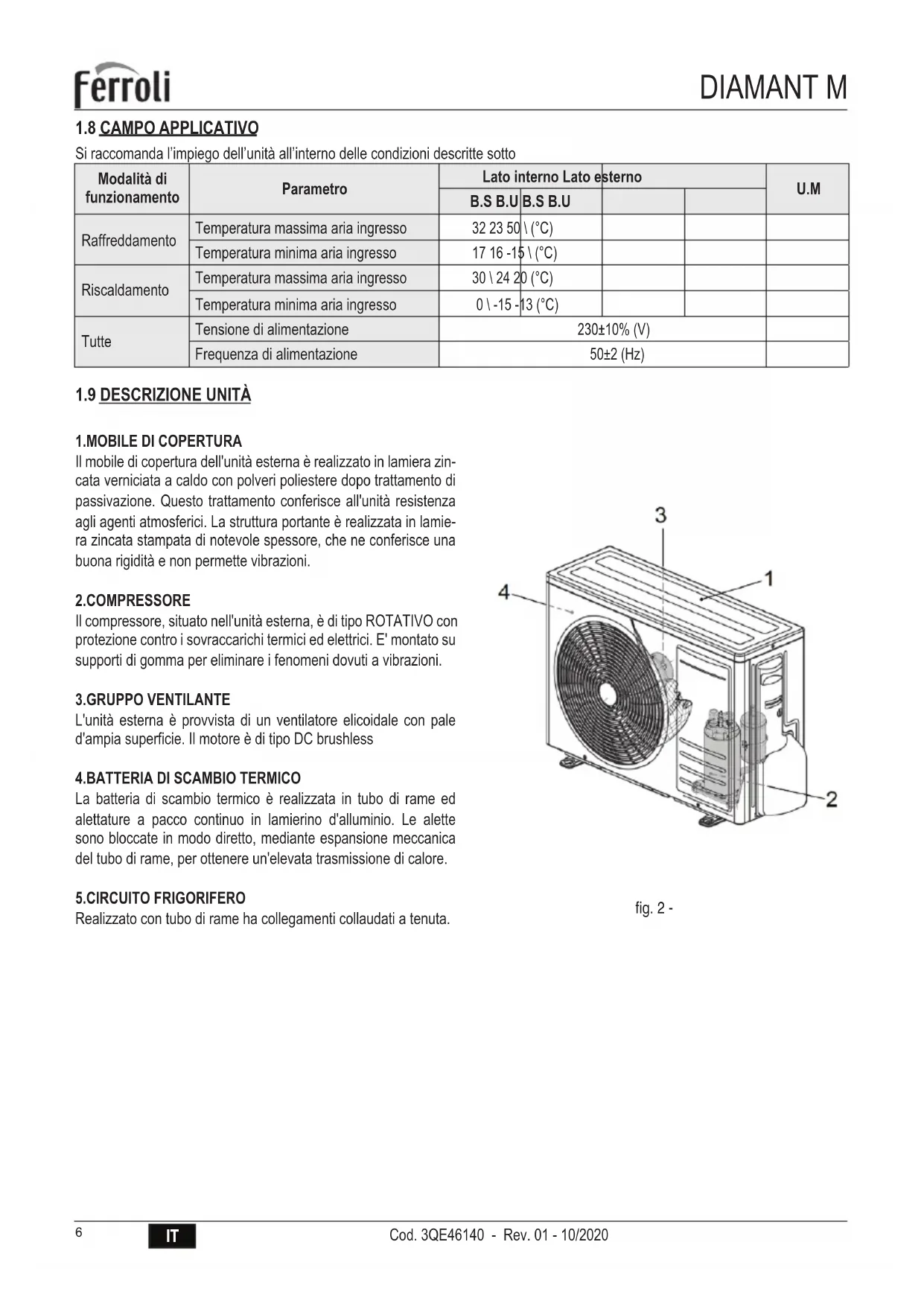 La batteria di scambio termico è realizzata in tubo di rame ed alettature a pacco continuo in lamierino d'alluminio. Le alette sono bloccate in modo diretto, mediante espansione meccanica del tubo di rame, per ottenere un'elevata trasmissione di calore. 5.CIRCUITO FRIGORIFERO Realizzato con tubo di rame ha collegamenti collaudati a tenuta. fig. 2 -IT Cod. 3QE46140 - Rev. 01 - 10/2020 DIAMANT M