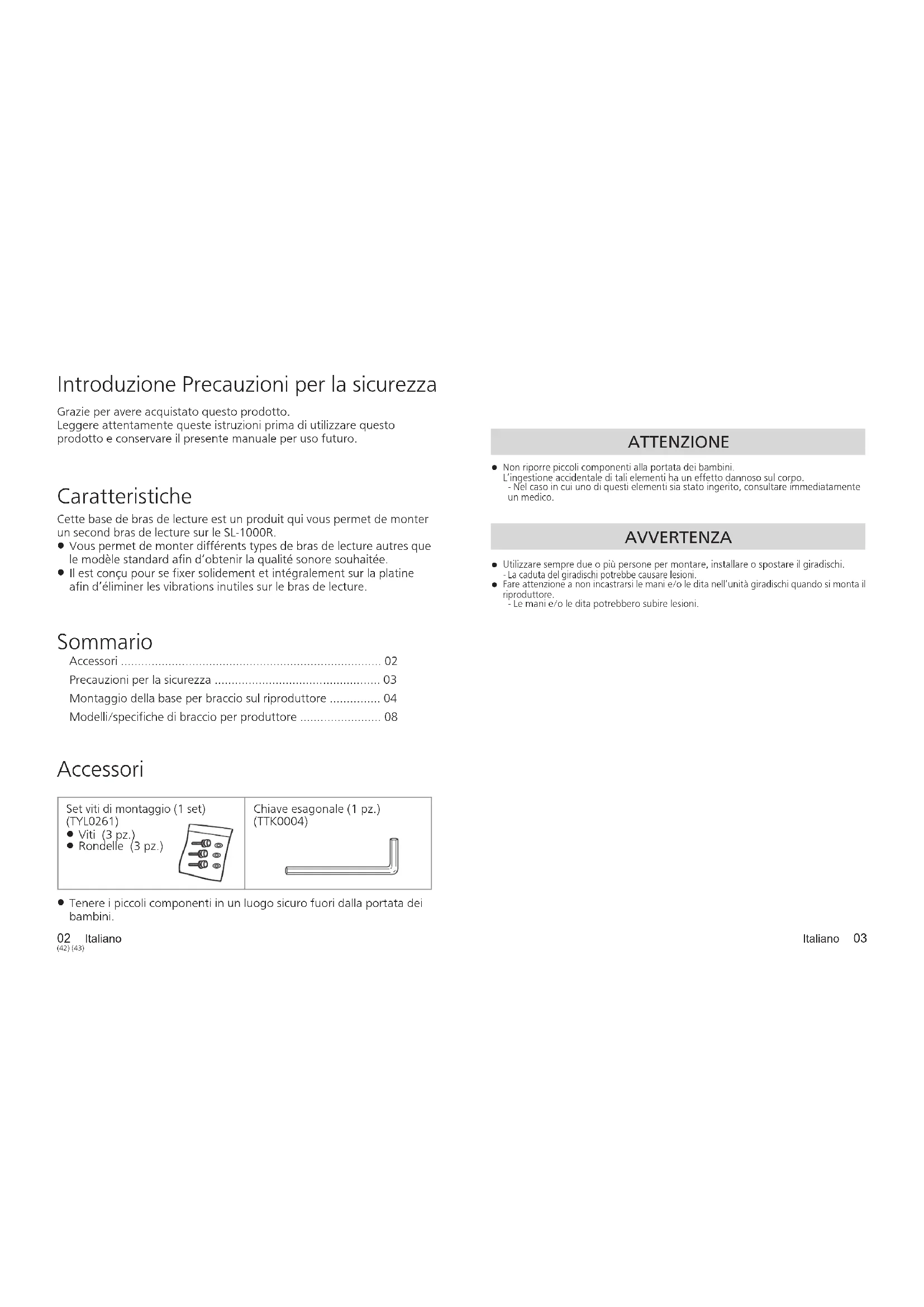 - Modelli/specifiche di braccio per produttore (42) (43) Italiano0504 Italiano Montaggio della base per braccio sul riproduttore Attenzione p. 8