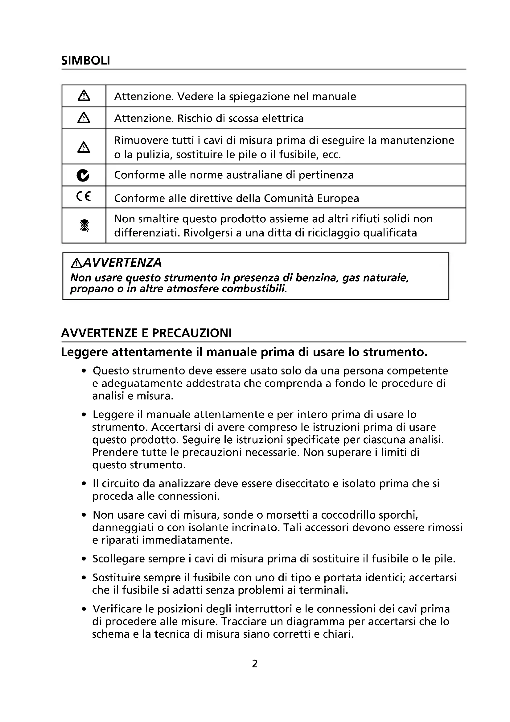 LVD: a norma EN61010-1:2010; EN61010-2-030:2010. Compatibilità elettromagnetica: a norma EN61326-1. Questo prodotto è conforme ai requisiti delle seguenti direttive della Comunità Europea: 2004/108/CE (Compatibilità elettromagnetica) e 2006/95/CE (Direttiva sulla bassa tensione) (marchio CE). Tuttavia, rumore elettrico o campi elettromagnetici intensi vicino all’apparecchio possono disturbare il circuito di misura. Inoltre gli strumenti di misura risponderanno a segnali indesiderati che possono essere presenti nel circuito di misura. Gli utenti devono esercitare cautela e prendere le opportune precauzioni per evitare risultati falsi quando si eseguono misure in presenza di interferenze elettroniche.12