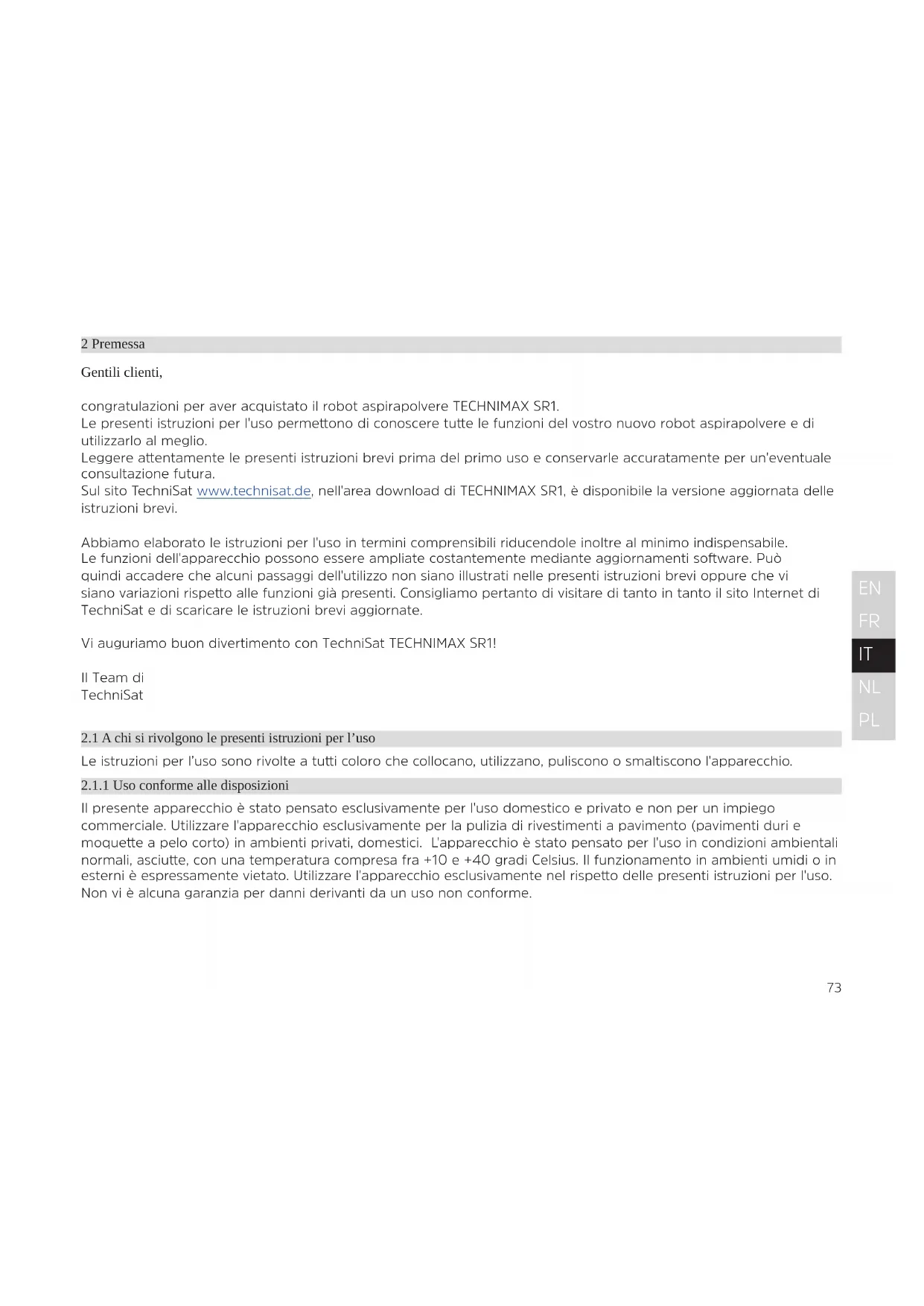 Navigazione Navigazione laser per mappare ed evitare le collisioni. Paracolpi perimetrale e sensori di caduta Indicatori Indicatore di stato LED Comunicazione WLAN e Bluetooth Frequenze WLAN/Bluetooth 2.400 ~ 2.4835 GHz Potenza di trasmissione WLAN 17dBm@11b 14dBm@11g 13dBm@11n Potenza di trasmissione Bluetooth max. +10 dBm Baeria Baeria agli ioni di litio da 14,6 V, 2.600 mAh Cicli di carica > 500 Alimentatore AC 100 - 240 V, 50/60 Hz DC 18 V, 1 A Classe di protezione IP20 Potenza assorbita In standby alla stazione di carica: < 2 W In standby con baeria: 1,5 W Durante il funzionamento, massimo (brevemente, massimo 3 sec.): ~192 W Durante il funzionamento, tipico: ~36 W Dimensioni Ø 34,6 cm, altezza 9 cm Peso 3,5 kg Condizioni ambientali temperatura d'esercizio +10 °C – +40 °C Condizioni ambientali temperatura di stoccaggio +5 °C – +50 °C Umidità dell'aria durante il funzionamento Umidità relativa 40% - 60% Umidità dell'aria per lo stoccaggio Umidità relativa 20% - 75% Codice articolo TECHNIMAX SR1 0000/7030 EAN: 4019588070301104 Technical data of the delivered power adapter Manufacturer TechniSat Digital GmbH, TechniPark, D-54550 Daun/ Eifel Model identifier CZH024180100EUWH Input voltage AC 100 - 240 V Input AC frequency 50/60 Hz Output voltage DC 18,0 V Output current 1,0 A Output power 18,0 W Average active eciency 87,4 % Eciency at low load (10%) 82,9 % No-load power consumption 0,04 W 9 AppuntiSnelstartgids TECHNIMAX SR1 Intelligente robotstofzuiger met lasernavigatie106 1 Inhoudsopgave