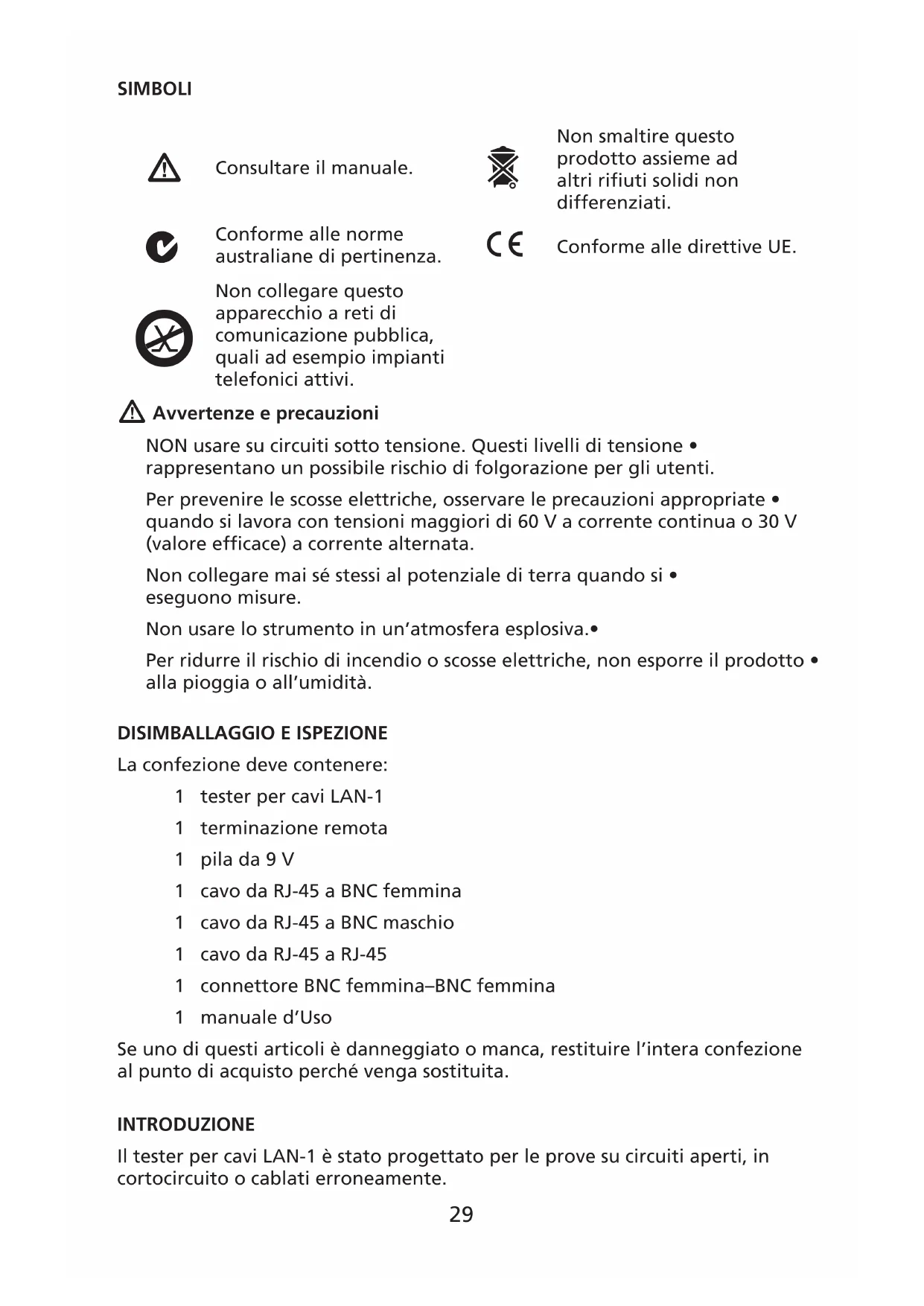 La confezione deve contenere: 1 tester per cavi LAN-1 1 terminazione remota 1 pila da 9 V 1 cavo da RJ-45 a BNC femmina 1 cavo da RJ-45 a BNC maschio 1 cavo da RJ-45 a RJ-45 1 connettore BNC femmina–BNC femmina 1 manuale d’Uso Se uno di questi articoli è danneggiato o manca, restituire l’intera confezione al punto di acquisto perché venga sostituita. INTRODUZIONE Il tester per cavi LAN-1 è stato progettato per le prove su circuiti aperti, in cortocircuito o cablati erroneamente.30 Le caratteristiche di prova sono le seguenti. Test della piedinatura per cavi 10/100 base-T, 10 base-2, modulari RJ-45, • AT&T 258A, EIA / TIA 568A/568B, Token Ring, ecc. Verifica di continuità dei cavi, circuiti aperti, cortocircuiti o cablaggi errati.• Test di cavi collegati a quadri o placche da parete usando il modulo di • terminazione remota. Cicalino di avvertenza in presenza di errori. • FUNZIONAMENTO Premere il pulsante 1. per accendere lo strumento. Se allo strumento non è collegato alcun cavo o se il cavo è difettoso, il cicalino suona. Premere BATT per verificare la tensione di alimentazione. Se la pila ha 2. una carica inferiore a 7 V, il LED BATT non si accende e il tester LAN-1 non funziona correttamente. I LED verdi sono gli indicatori dell’origine. I LED rossi sono gli indicatori di 3. test. Quando i LED rossi sono accesi, indicano continuità nel cavo. Quando sono spenti, indicano un circuito aperto. Test di loopback (cavo con entrambe le estremità nello stesso punto) Collegare il cavo con due terminazioni RJ-45 ai connettori di test IN e OUT.1. Premere il pulsante 2. per accendere lo strumento. Premere il pulsante AUTO (impostazione predefinita) o MAN per iniziare la scansione. La modalità automatica esegue la scansione delle linee da 1 a 8 e della 3. terra (se collegata), ripetendo i test finché non viene fermata. Il pulsante MAN attiva la modalità manuale, mentre il pulsante TEST 4. permette di passare da una linea all’altra. Test remoto (cavo con le estremità in punti diversi) Collegare una estremità del cavo al connettore OUT.1. Collegare la TERMINAZIONE REMOTA all’altra estremità del cavo 2. sotto test. Premere il pulsante 3. per accendere lo strumento. Premere il pulsante AUTO (impostazione predefinita) o MAN per iniziare la scansione. La modalità automatica esegue la scansione delle linee da 1 a 8 e della 4. terra (se collegata), ripetendo i test finché non viene fermata. Il pulsante MAN attiva la modalità manuale, mentre il pulsante TEST 5. permette di passare da una linea all’altra. I risultati dei test sulla linea (LED rossi) sono visualizzati sulla 6. terminazione remota. Hold Il pulsante HOLD permette di salvare la condizione di errore visualizzata e di interrompere il test. Premere HOLD per tornare al normale funzionamento.31