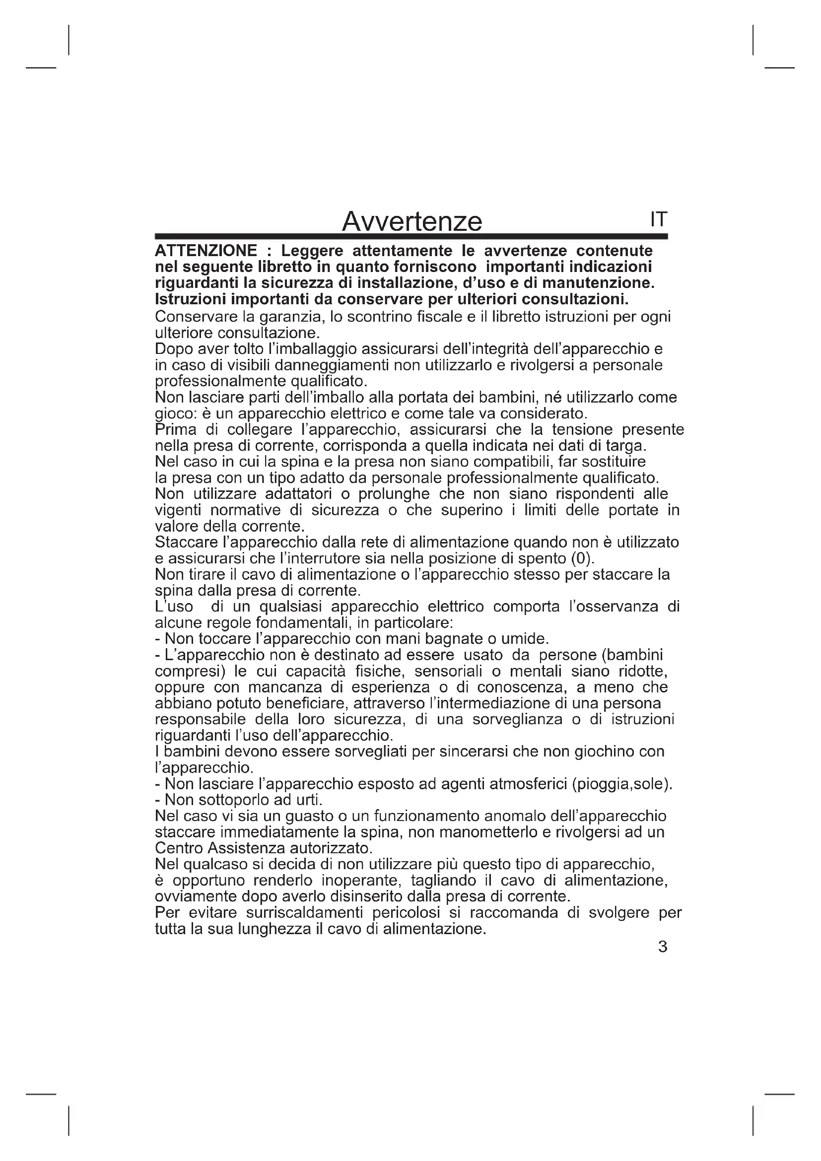 ATTENZIONE : Leggere attentamente le avvertenze contenute nel seguente libretto in quanto forniscono importanti indicazioni riguardanti la sicurezza di installazione, d’uso e di manutenzione. Istruzioni importanti da conservare per ulteriori consultazioni. Conservare la garanzia, lo scontrino scale e il libretto istruzioni per ogni ulteriore consultazione. Dopo aver tolto l’imballaggio assicurarsi dell’integrità dell’apparecchio e in caso di visibili danneggiamenti non utilizzarlo e rivolgersi a personale professionalmente qualicato. Non lasciare parti dell’imballo alla portata dei bambini, né utilizzarlo come gioco: è un apparecchio elettrico e come tale va considerato. Prima di collegare l’apparecchio, assicurarsi che la tensione presente nella presa di corrente, corrisponda a quella indicata nei dati di targa. Nel caso in cui la spina e la presa non siano compatibili, far sostituire la presa con un tipo adatto da personale professionalmente qualicato. Non utilizzare adattatori o prolunghe che non siano rispondenti alle vigenti normative di sicurezza o che superino i limiti delle portate in valore della corrente. Staccare l’apparecchio dalla rete di alimentazione quando non è utilizzato e assicurarsi che l’interrutore sia nella posizione di spento (0). Non tirare il cavo di alimentazione o l’apparecchio stesso per staccare la spina dalla presa di corrente. L’uso di un qualsiasi apparecchio elettrico comporta l’osservanza di alcune regole fondamentali, in particolare: - Non toccare l’apparecchio con mani bagnate o umide. - L’apparecchio non è destinato ad essere usato da persone (bambini compresi) le cui capacità siche, sensoriali o mentali siano ridotte, oppure con mancanza di esperienza o di conoscenza, a meno che abbiano potuto beneciare, attraverso l’intermediazione di una persona responsabile della loro sicurezza, di una sorveglianza o di istruzioni riguardanti l’uso dell’apparecchio. I bambini devono essere sorvegliati per sincerarsi che non giochino con l’apparecchio. - Non lasciare l’apparecchio esposto ad agenti atmosferici (pioggia,sole). - Non sottoporlo ad urti. Nel caso vi sia un guasto o un funzionamento anomalo dell’apparecchio staccare immediatamente la spina, non manometterlo e rivolgersi ad un Centro Assistenza autorizzato. Nel qualcaso si decida di non utilizzare più questo tipo di apparecchio, è opportuno renderlo inoperante, tagliando il cavo di alimentazione, ovviamente dopo averlo disinserito dalla presa di corrente. Per evitare surriscaldamenti pericolosi si raccomanda di svolgere per tutta la sua lunghezza il cavo di alimentazione.Se il cavo di alimentazione dovesse essere danneggiato, deve essere sostituito solamente presso i centri di assistenza autorizzati dal costruttore. Per motivi di sicurezza l’apparecchio non può essere smontato. L’apparecchio è stato costruito e concepito per funzionare in ambienti domestici, pertanto ogni altro uso è da considerarsi improprio e quindi pericoloso. Non introdurre alcun oggetto attraverso la griglia di protezione e le prese d’aria. L’apparecchio deve essere installato in una posizione ssa (vedere istruzioni di montaggio) in modo che l’utilizzatore, all’interno di una vasca da bagno o di una doccia, non possa toccarlo. Non posizionare l’apparecchio immediatamente al di sotto di una presa di corrente. Non utilizzare questo apparecchio nelle immediate vicinanze di una vasca da bagno, di una doccia o di una piscina. Non utilizzare l’apparecchio in presenza di materiale inammabile (benzina, vernici ecc.). Tenere il cavo lontano da fonti di calore. Al ne di evitare ogni pericolo dovuto al riarmo accidentale del dispositivo termico di interruzione, il presente apparecchio non deve essere alimentato con un dispositivo di manovra esterno, quale un temporizzatore oppure essere connesso a un circuito che viene regolarmente alimentato o disalimentato dal servizio. ATTENZIONE : NON UTILIZZARE IL PRODOTTO IN PROSSIMITÀ DI TENDE O DI ALTRI MATERIALI COMBUSTIBILI.