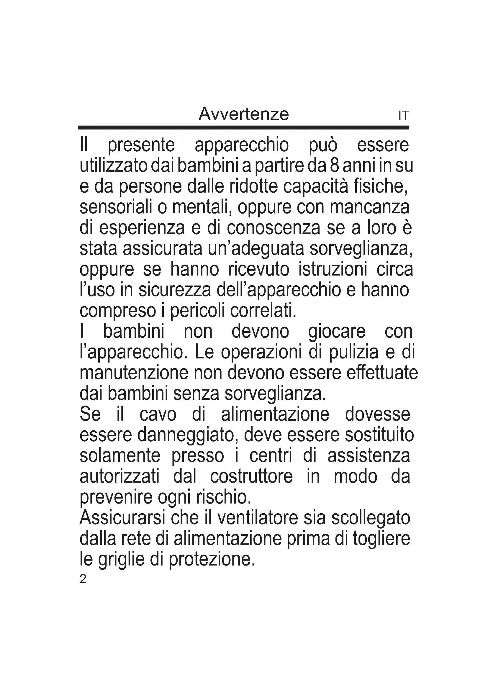 Avvertenze Il presente apparecchio può essere utilizzato dai bambini a partire da 8 anni in su e da persone dalle ridotte capacità siche, sensoriali o mentali, oppure con mancanza di esperienza e di conoscenza se a loro è stata assicurata un’adeguata sorveglianza, oppure se hanno ricevuto istruzioni circa l’uso in sicurezza dell’apparecchio e hanno compreso i pericoli correlati. I bambini non devono giocare con l’apparecchio. Le operazioni di pulizia e di manutenzione non devono essere eettuate dai bambini senza sorveglianza. Se il cavo di alimentazione dovesse essere danneggiato, deve essere sostituito solamente presso i centri di assistenza autorizzati dal costruttore in modo da prevenire ogni rischio. Assicurarsi che il ventilatore sia scollegato dalla rete di alimentazione prima di togliere le griglie di protezione. IT3 ATTENZIONE: leggere attentamente il presente libretto in quanto contiene importanti istruzioni per la sicurezza di installazione, uso e manutenzione. Istruzioni importanti da conservare per riferimenti futuri. I bambini NON devono giocare con il dispositivo. Questo apparecchio dovrà essere destinato solo all’uso per il quale è stato espressamente concepito; qualsiasi impiego non conforme alle indicazioni contenute nel presente manuale è da considerarsi improprio e pericoloso. Il produttore non può essere ritenuto responsabile per eventuali danni derivanti da utilizzo improprio e/o irragionevole. Questo apparecchio NON è idoneo per impiego in ambienti con atmosfere esplosive (con presenza di sostanze inammabili sotto forma di gas, vapore, nebbia o polvere, in condizioni atmosferiche in cui, dopo l’accensione, la combustione si propaga nell’aria). Gli elementi dell’imballaggio (sacchetti in plastica, polistirolo espanso, etc.) non devono essere lasciati alla portata di bambini o incapaci in quanto rappresentano potenziali fonti di pericolo. L’installazione/assemblaggio del dispositivo dovrà essere eettuata/o secondo le prescrizioni del costruttore. Una errata procedura può causare danni a persone, animali o cose, per i quali il costruttore non può essere ritenuto responsabile. Posizionare ed utilizzare l’apparecchio su un piano d’appoggio orizzontale e stabile. Prima di utilizzare l’apparecchio vericare visivamente l’integrità del medesimo e del suo cavo di alimentazione. In caso di dubbi rivolgersi a personale qualicato. Prima di alimentare l’apparecchio accertarsi che i suoi dati di targa (tensione e frequenza) siano rispondenti a quelli della rete di distribuzione elettrica e che la presa sia idonea al terminale del cavo di cui l’apparecchio è dotato. Vericare che l’impianto elettrico utilizzato per l’alimentazione sia dotato delle adeguate protezioni a norma delle leggi in vigore. NON alimentare l’apparecchio mediante prese multiple. Evitare se possibile l’impiego di adattatori e/o prolunghe; qualora il loro Non collegare l’apparecchio all’alimentazione e non utilizzarlo se non è completamente montato (vedi istruzioni di montaggio).4 impiego si rendesse indispensabile utilizzare esclusivamente materiale conforme alle vigenti norme di sicurezza e nel rispetto dei parametri elettrici degli adattatori in questione. L’apparecchio non deve essere acceso mediante temporizzatori esterni e/o altri dispositivi di controllo remoto non espressamente previsti dal presente manuale. NON utilizzare né conservare il dispositivo in prossimità di fonti di calore localizzate (caloriferi, stufe etc.). NON immergere l’apparecchio in acqua o altri liquidi; in caso di caduta accidentalmente in acqua NON cercare di recuperarlo ma innanzitutto scollegare immediatamente il cavo di alimentazione dalla presa elettrica. Utilizzando l’apparecchio per la prima volta, assicurarsi di aver tolto ogni etichetta o foglio di protezione che ne impedisca il corretto funzionamento. Collegare e scollegare il cavo di alimentazione con le mani asciutte e reggendolo saldamente. Prima di inserire la spina nella presa di corrente assicurarsi che il pulsante di avviamento dell’apparecchio sia in posizione “OFF” (spento). Svolgere sempre totalmente il cavo di alimentazione onde evitare surriscaldamenti, evitare in ogni caso di tenderlo (non tirarlo, strattonarlo, né utilizzarlo per trascinare il dispositivo cui è collegato). Evitare di posizionare il cavo di alimentazione su superci abrasive o taglienti o comunque in posizioni dove può essere facilmente danneggiato. NON ostruire né totalmente né parzialmente le prese d’aria nè inserirvi oggetti all’interno. Durante il funzionamento non toccare il dispositivo con parti del corpo bagnate o umide, in ogni caso si consiglia di interporre fra se e il piano di appoggio un elemento isolante (ad esempio indossando scarpe con suola in gomma). Durante l’uso l’apparecchio deve essere tenuto a distanza di sicurezza da qualsiasi oggetto e/o sostanza inammabile o potenzialmente esplosiva. In caso di funzionamento anomalo o di anomalie durante il funzionamento spegnere subito l’apparecchio, scollegarlo dall’alimentazione, vericare le cause delle anomalie riscontrate eventualmente con l’aiuto di personale qualicato. Evitare in ogni caso di eettuare operazioni non previste dal presente manuale d’uso (come smontarlo e/o modicarlo). Ricordarsi di scollegare sempre il cavo di alimentazione del dispositivo per periodi di inutilizzo prolungati, prima di riporlo e prima di eettuare qualsiasi operazione di pulizia o manutenzione. Conservare e utilizzare l’apparecchio esclusivamente in ambienti interni o in ogni caso protetto da agenti atmosferici come pioggia, irraggiamento diretto del sole o polvere. L’apparecchio non è progettato per l’uso o la conservazione in esterno. La pulizia e manutenzione del dispositivo NON deve essere eettuata da5 bambini senza la supervisione di un adulto. Prima di scollegare l’apparecchio spegnerlo mediante l’apposito comando sul pannello di controllo. All