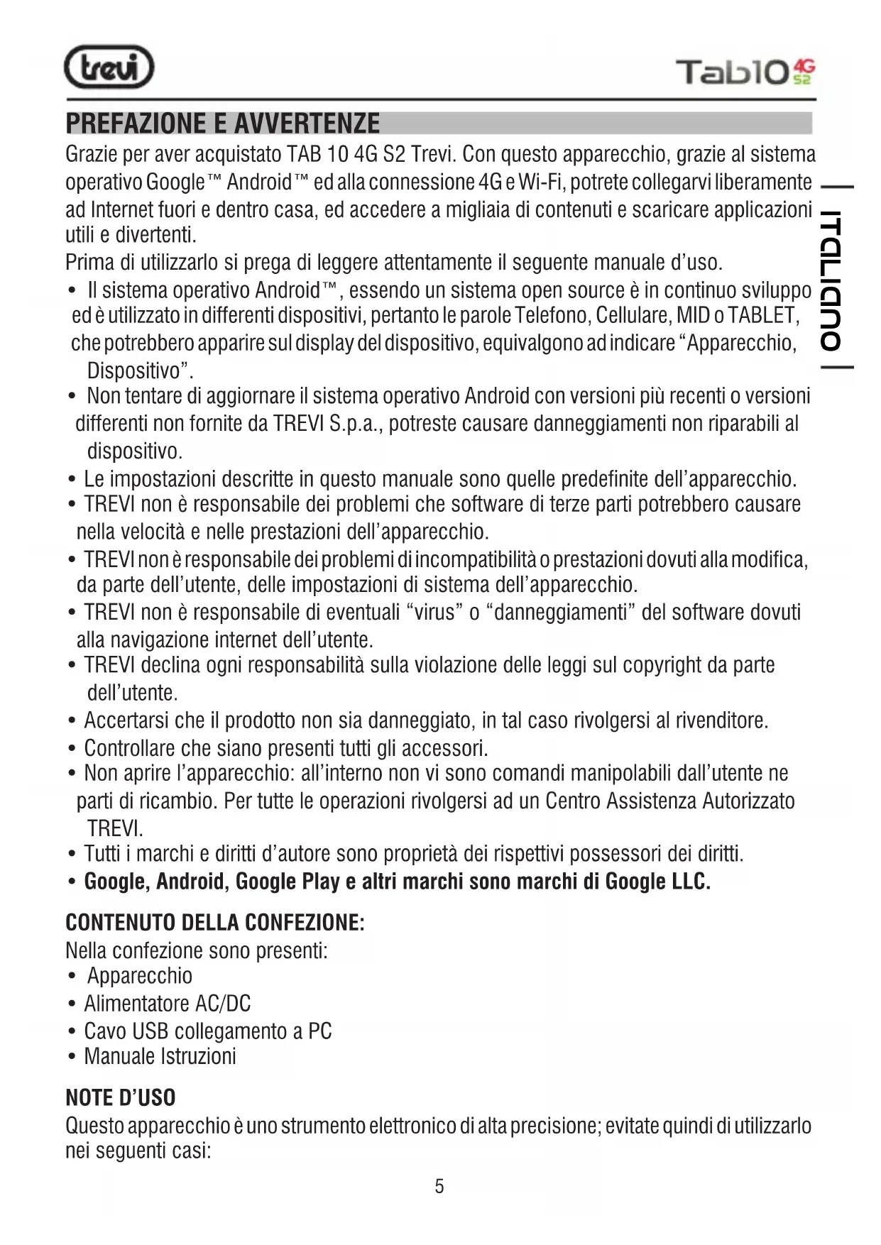 Grazie per aver acquistato TAB 10 4G S2 Trevi. Con questo apparecchio, grazie al sistema operativo Google™ Android™ ed alla connessione 4G e Wi-Fi, potrete collegarvi liberamente ad Internet fuori e dentro casa, ed accedere a migliaia di contenuti e scaricare applicazioni utili e divertenti. Prima di utilizzarlo si prega di leggere attentamente il seguente manuale d’uso.