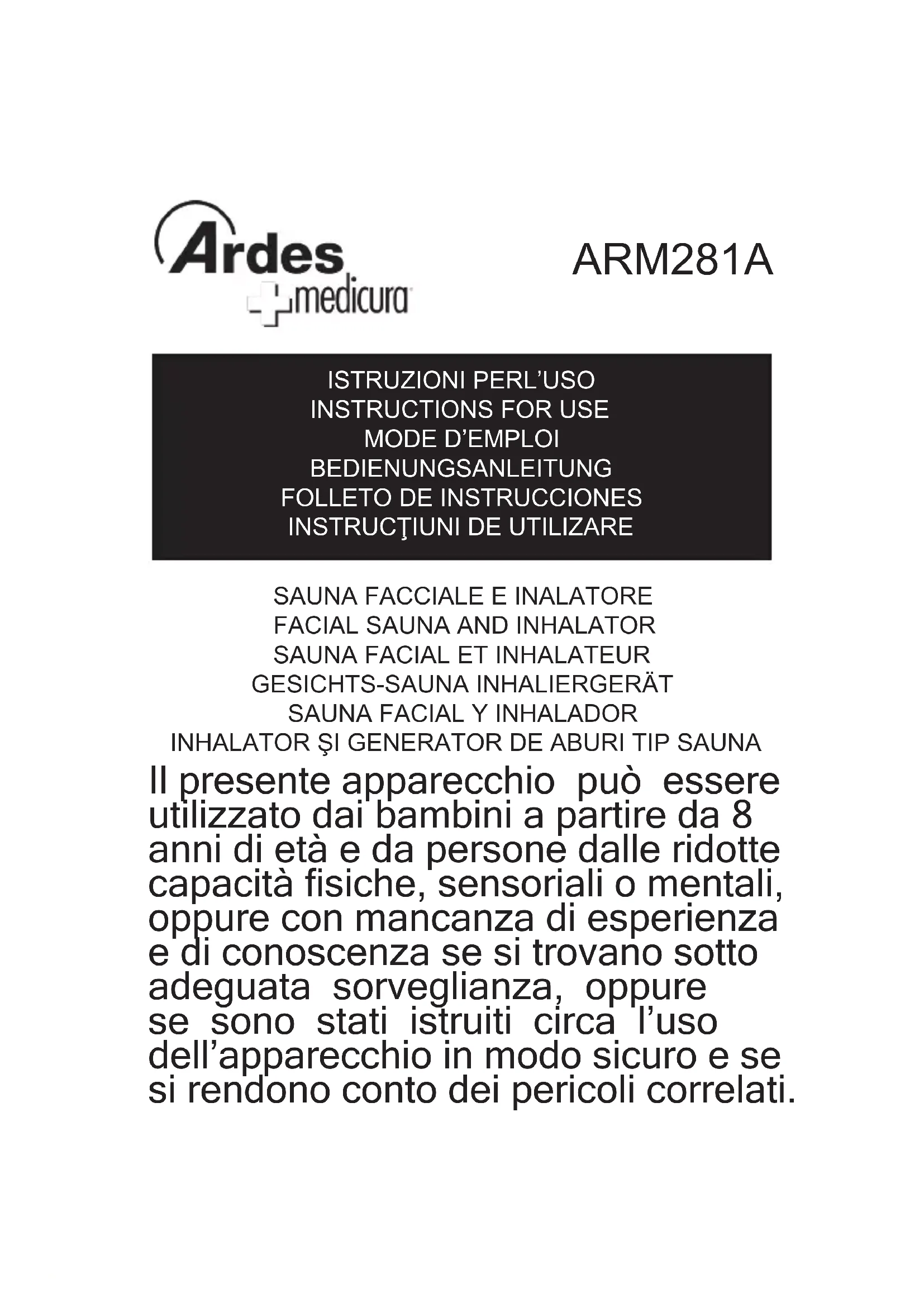 Il presente apparecchio può essere utilizzato dai bambini a partire da 8 anni di età e da persone dalle ridotte capacità siche, sensoriali o mentali, oppure con mancanza di esperienza e di conoscenza se si trovano sotto adeguata sorveglianza, oppure se sono stati istruiti circa l’uso dell’apparecchio in modo sicuro e se si rendono conto dei pericoli correlati. ARM281A