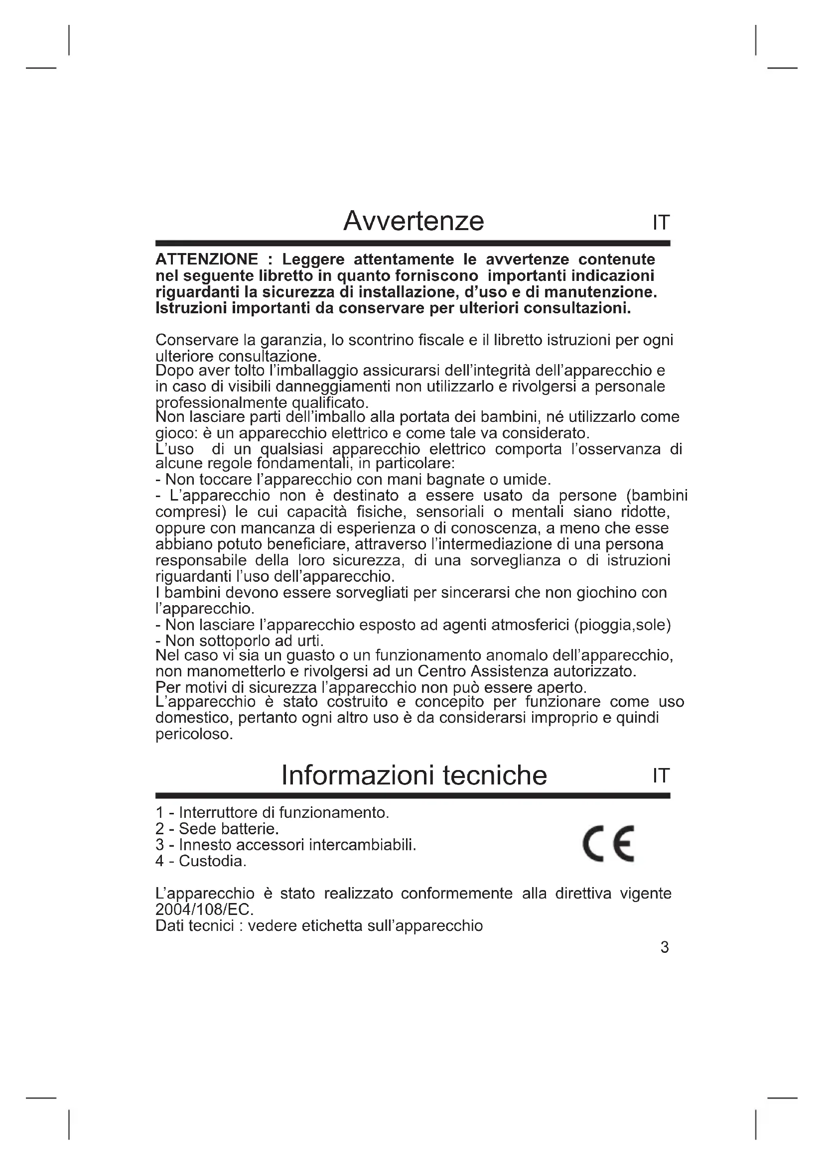 ATTENZIONE : Leggere attentamente le avvertenze contenute nel seguente libretto in quanto forniscono importanti indicazioni riguardanti la sicurezza di installazione, d’uso e di manutenzione. Istruzioni importanti da conservare per ulteriori consultazioni. Conservare la garanzia, lo scontrino scale e il libretto istruzioni per ogni ulteriore consultazione. Dopo aver tolto l’imballaggio assicurarsi dell’integrità dell’apparecchio e in caso di visibili danneggiamenti non utilizzarlo e rivolgersi a personale professionalmente qualicato. Non lasciare parti dell’imballo alla portata dei bambini, né utilizzarlo come gioco: è un apparecchio elettrico e come tale va considerato. L’uso di un qualsiasi apparecchio elettrico comporta l’osservanza di alcune regole fondamentali, in particolare: - Non toccare l’apparecchio con mani bagnate o umide. - L’apparecchio non è destinato a essere usato da persone (bambini compresi) le cui capacità siche, sensoriali o mentali siano ridotte, oppure con mancanza di esperienza o di conoscenza, a meno che esse abbiano potuto beneciare, attraverso l’intermediazione di una persona responsabile della loro sicurezza, di una sorveglianza o di istruzioni riguardanti l’uso dell’apparecchio. I bambini devono essere sorvegliati per sincerarsi che non giochino con l’apparecchio. - Non lasciare l’apparecchio esposto ad agenti atmosferici (pioggia,sole) - Non sottoporlo ad urti. Nel caso vi sia un guasto o un funzionamento anomalo dell’apparecchio, non manometterlo e rivolgersi ad un Centro Assistenza autorizzato. Per motivi di sicurezza l’apparecchio non può essere aperto. L’apparecchio è stato costruito e concepito per funzionare come uso domestico, pertanto ogni altro uso è da considerarsi improprio e quindi pericoloso. Informazioni tecniche