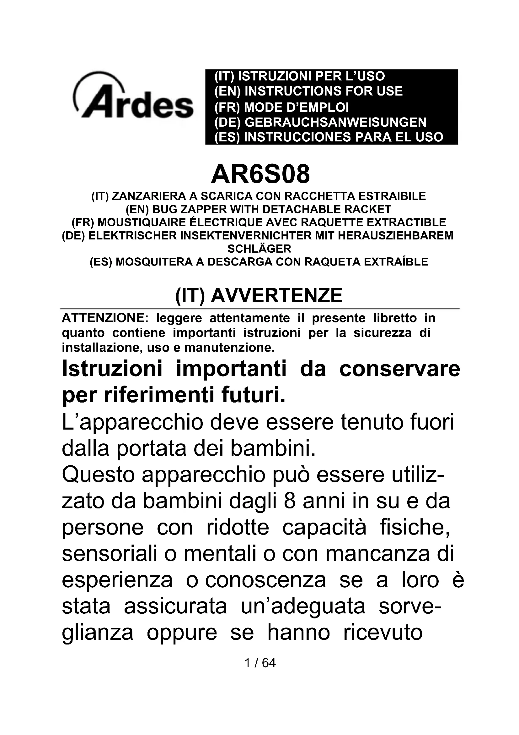 AR6S08 (IT) ZANZARIERA A SCARICA CON RACCHETTA ESTRAIBILE (EN) BUG ZAPPER WITH DETACHABLE RACKET (FR) MOUSTIQUAIRE ÉLECTRIQUE AVEC RAQUETTE EXTRACTIBLE (DE) ELEKTRISCHER INSEKTENVERNICHTER MIT HERAUSZIEHBAREM SCHLÄGER (ES) MOSQUITERA A DESCARGA CON RAQUETA EXTRAÍBLE (IT) AVVERTENZE ATTENZIONE: leggere attentamente il presente libretto in quanto contiene importanti istruzioni per la sicurezza di installazione, uso e manutenzione. Istruzioni importanti da conservare per riferimenti futuri. L’apparecchio deve essere tenuto fuori dalla portata dei bambini. Questo apparecchio può essere utiliz- zato da bambini dagli 8 anni in su e da persone con ridotte capacità fisiche, sensoriali o mentali o con mancanza di esperienza o conoscenza se a loro è stata assicurata un’adeguata sorve- glianza oppure se hanno ricevuto2 / 64 istruzioni circa l’uso in sicurezza dell’apparecchio e hanno compreso i pericoli correlati. I bambini non devono giocare con l’apparecchio. Le operazioni di pulizia e di manutenzione non devono essere effettuate da bambini senza sorveglianza. L’apparecchio è previsto solo per uso interno, in ogni caso protetto da agenti atmosferici come pioggia, irraggiamento diretto del sole o polvere. L’apparecchio non deve essere utilizzato all’interno di fienili, stalle ed ambienti simili. L’apparecchio non deve essere usato in ambienti dove potrebbero essere presenti vapori infiammabili o polveri esplosive.3 / 64 Le lampade di questo apparecchio possono essere sostituite solo presso i centri assistenza autorizzati dal costruttore, in modo da prevenire ogni rischio. ATTENZIONE: questo apparecchio contiene batterie che possono essere sostituite solo da persone esperte. La batteria deve essere rimossa dall’apparecchio prima dello smaltimento (vedere il paragrafo “Batterie“ nella sezione “Istruzioni d’uso“). La batteria deve essere smaltita in modo sicuro (vedi sezione SMALTIMENTO). L’apparecchio deve essere alimentato solo a bassissima tensione di sicurezza corrispondente a quella indicata sull’apparecchio (5V DC). ATTENZIONE: per alimentare l’apparecchio e per ricaricare la4 / 64 batteria, utilizzare solo l’unità di alimentazione separabile fornita con l’apparecchio. Modello dell’unità di alimentazione separabile Non utilizzare l’apparecchio se le batterie dovessero presentare segni di deterioramento (ad esempio, in caso di odore anomalo, deformazione dell‘apparecchio). Rivolgersi ad un centro assistenza autorizzato dal costruttore.
