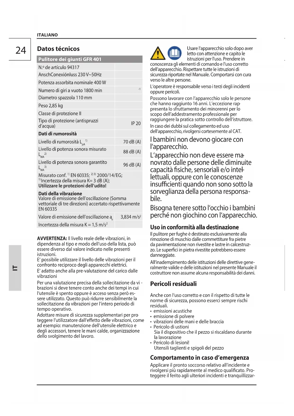 AVVERTENZA: Il livello reale delle vibrazioni, in dipendenza al tipo e modo dell‘uso della lista, può essere diverso dal valore indicato nelle presenti istruzioni. E‘ possibile utilizzare il livello delle vibrazioni per il confronto reciproco degli apparecchi elettrici. E‘ adatto anche alla pre-valutazione del carico dalle vibrazioni Per una valutazione precisa della sollecitazione davi