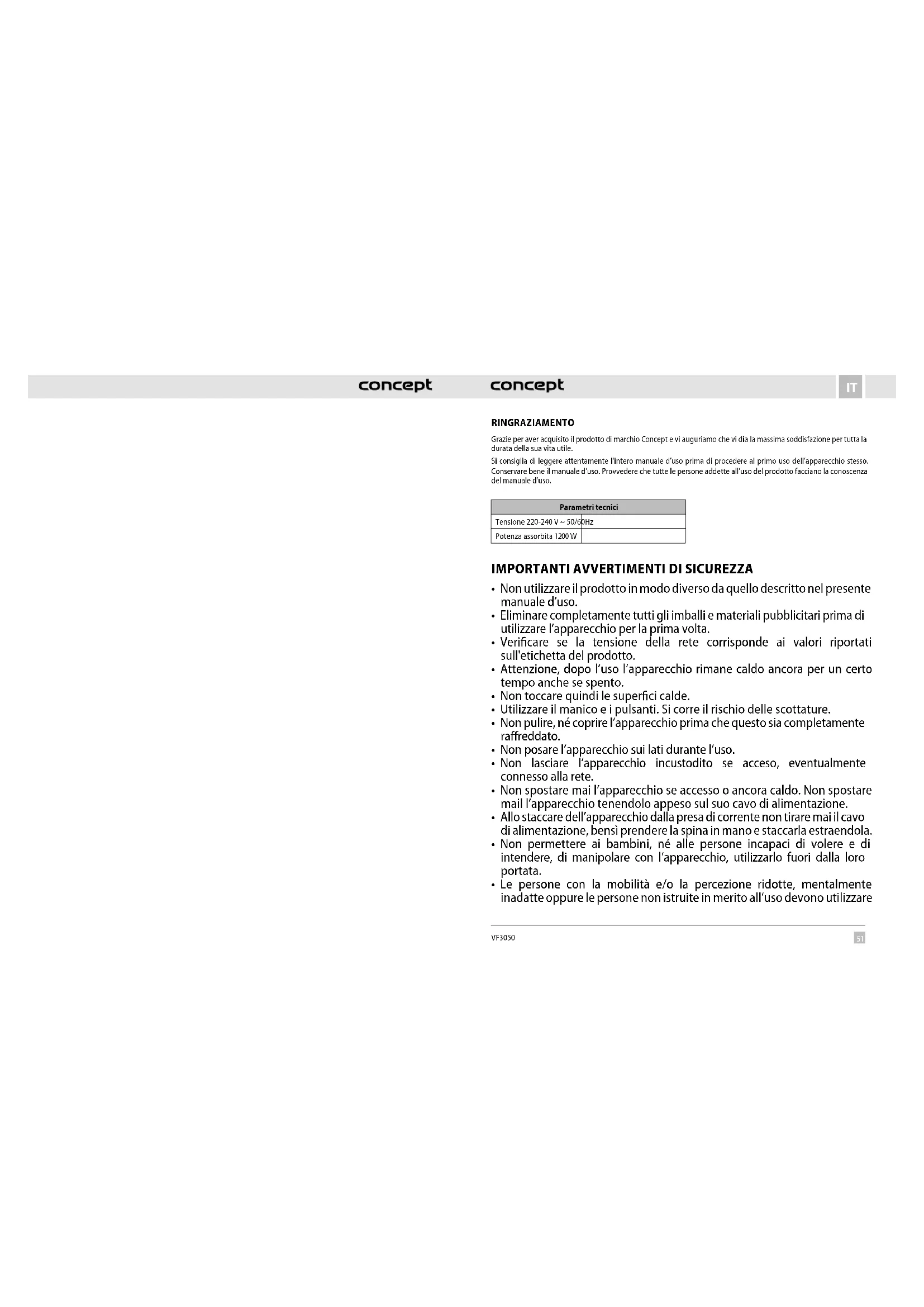 VF3050 RINGRAZIAMENTO Grazie per aver acquisito il prodotto di marchio Concept e vi auguriamo che vi dia la massima soddisfazione per tutta la durata della sua vita utile. Si consiglia di leggere attentamente l’intero manuale d’uso prima di procedere al primo uso dell’apparecchio stesso. Conservare bene il manuale d’uso. Provvedere che tutte le persone addette all’uso del prodotto facciano la conoscenza del manuale d’uso. Parametri tecnici Tensione 220-240 V ~ 50/60Hz Potenza assorbita 1200 W